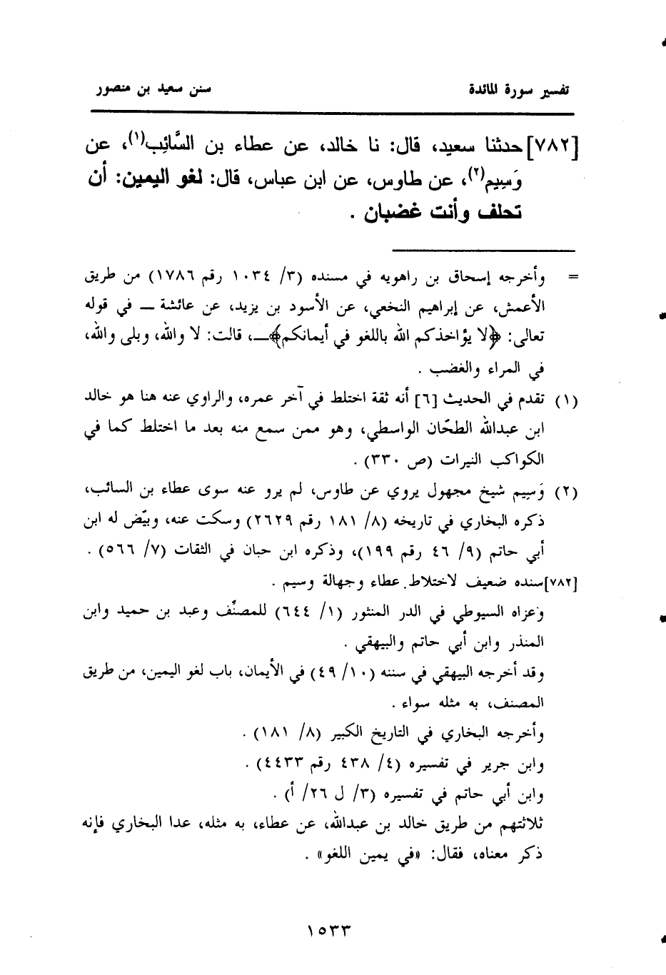 ٧٨٢ - حَدَّثَنَا سَعِيدٌ، قَالَ: نا خَالِدُ، عَنْ عَطَاءِ بْنِ السَّائِب (¬١)، عَنْ وَسِيم (¬٢)، عَنْ طَاوُسٍ، عَنِ ابْنِ عَبَّاسٍ، قَالَ: لَغْوُ الْيَمِينِ: أَنْ تحلف وأنت غضبان.