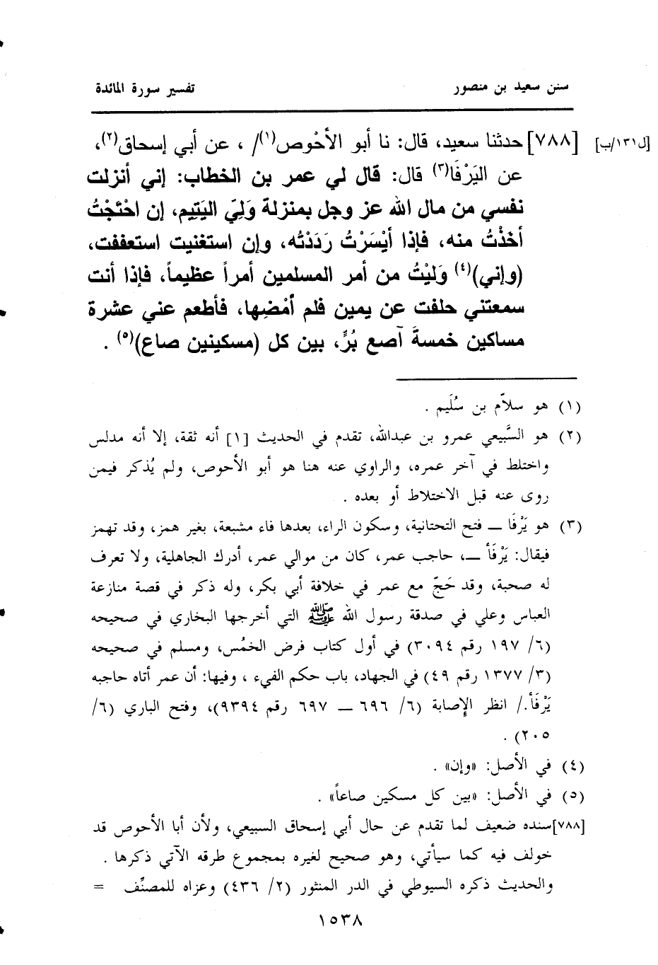 ٧٨٨ - حَدَّثَنَا سَعِيدٌ، قَالَ: نا أَبُو الأحْوص (¬١) [ل ١٣١/ب]، عَنْ أَبِي إِسْحَاقَ (¬٢)، عَنِ اليَرْفَا (¬٣) قَالَ: قَالَ لِي عُمَرُ بْنُ الْخَطَّابِ: إِنِّي أَنْزَلْتُ نَفْسِي مِنْ مَالِ اللَّهِ عَزَّ وَجَلَّ بِمَنْزِلَةِ وَلِيّ اليَتِيم، إِنِ احْتَجْتُ أخَذْتُ مِنْهُ، فَإِذَا أيْسَرْتُ رَدَدْتُه، وَإِنِ اسْتَغْنَيْتُ اسْتَعْفَفْتُ، (وَإِنِّي) (¬٤) وَليْتُ مِنْ أَمْرِ الْمُسْلِمِينَ أَمْرًا عَظِيمًا، فَإِذَا أَنْتَ سَمِعْتَنِي حَلَفْتُ عَنْ يَمِينٍ فَلَمْ أمْضِها، فَأَطْعِمْ عَنِّي عَشَرَةَ مَسَاكِينَ خمسةَ آصَعَ بُرٍّ، بَيْنَ كل (مسكينين صاع) (¬٥).