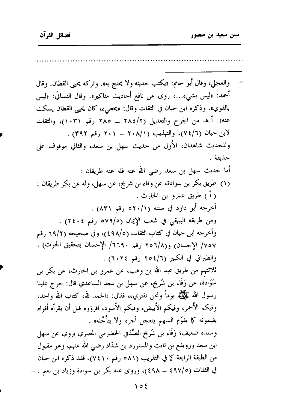 ثلاثتهم من طريق عَبْدُ اللَّهِ بْنُ وَهْبٍ، عَنْ عمرو بن الحارث، عن بكر بن سَوَادة، عن وَفَاء بن شُريح، عن سهل بن سعد الساعدي، قَالَ: خَرَجَ عَلَيْنَا رَسُولُ اللَّهِ - صَلَّى اللهُ عَلَيْهِ وَسَلَّمَ - يَوْمًا ونحن نقترئ، فقال: ((الحمد لله، كتاب الله واحد، وفيكم الأحمر، وفيكم الأبيض، وفيكم الأسود، اقرؤوه قبل أن يقرأه أقوام يقيمونه كما يقوّم السهم يتعجل أجره ولا يتأجَّله)) .