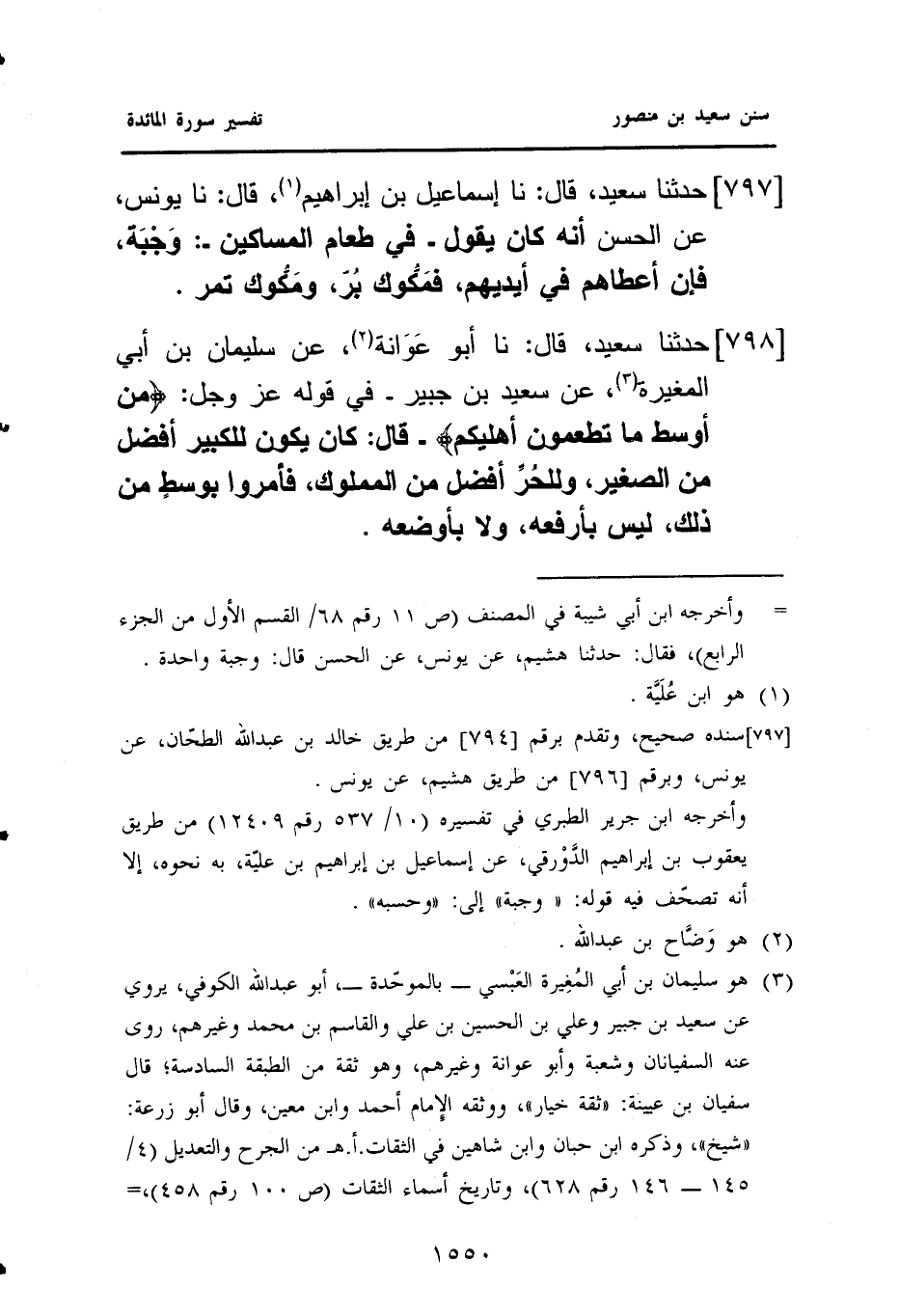 ٧٩٨ - حَدَّثَنَا سَعِيدٌ، قَالَ: نا أَبُو عَوَانة (¬٢)، عَنْ سُلَيْمَانَ بْنِ أَبِي الْمُغِيرَةِ (¬٣)، عَنْ سَعِيدِ بْنِ جُبَيْرٍ - فِي قَوْلِهِ عَزَّ وَجَلَّ: {مِنْ أَوْسَطِ مَا تُطْعِمُونَ أهليكم} -، قَالَ: كَانَ يَكُونُ لِلْكَبِيرِ أَفْضَلُ مِنَ الصَّغِيرِ، وللحُرِّ أَفْضَلُ مِنَ الْمَمْلُوكِ، فَأُمِرُوا بوسطٍ مِنْ ذَلِكَ ليس بأرفعه، ولا بأوضعه.