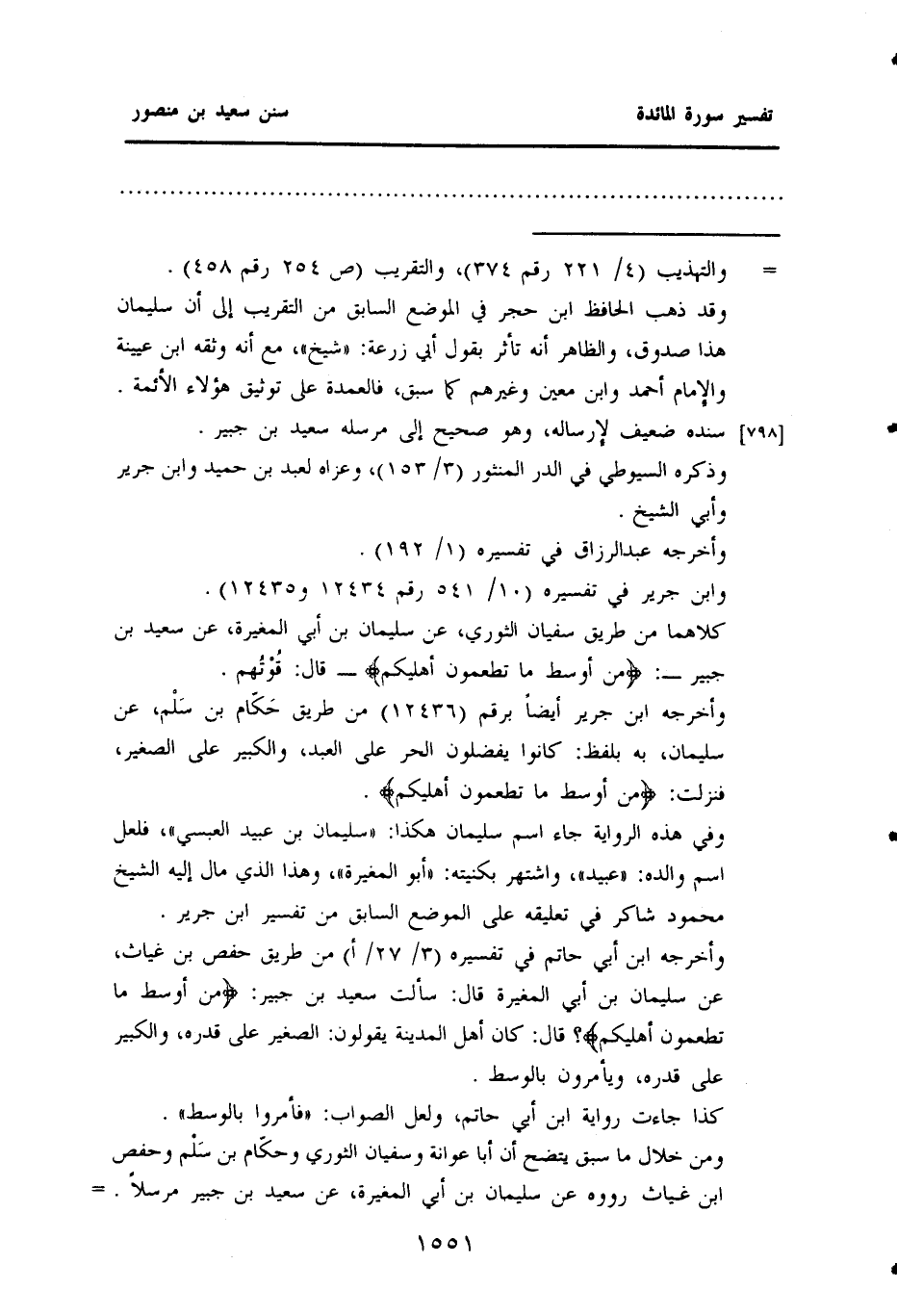 كلاهما من طريق سفيان الثوري، عَنْ سُلَيْمَانَ بْنِ أَبِي الْمُغِيرَةِ، عن سعيد بن جبير -: {مِنْ أَوْسَطِ مَا تُطْعِمُونَ أَهْلِيكُمْ} - قال: قُوْتُهم.