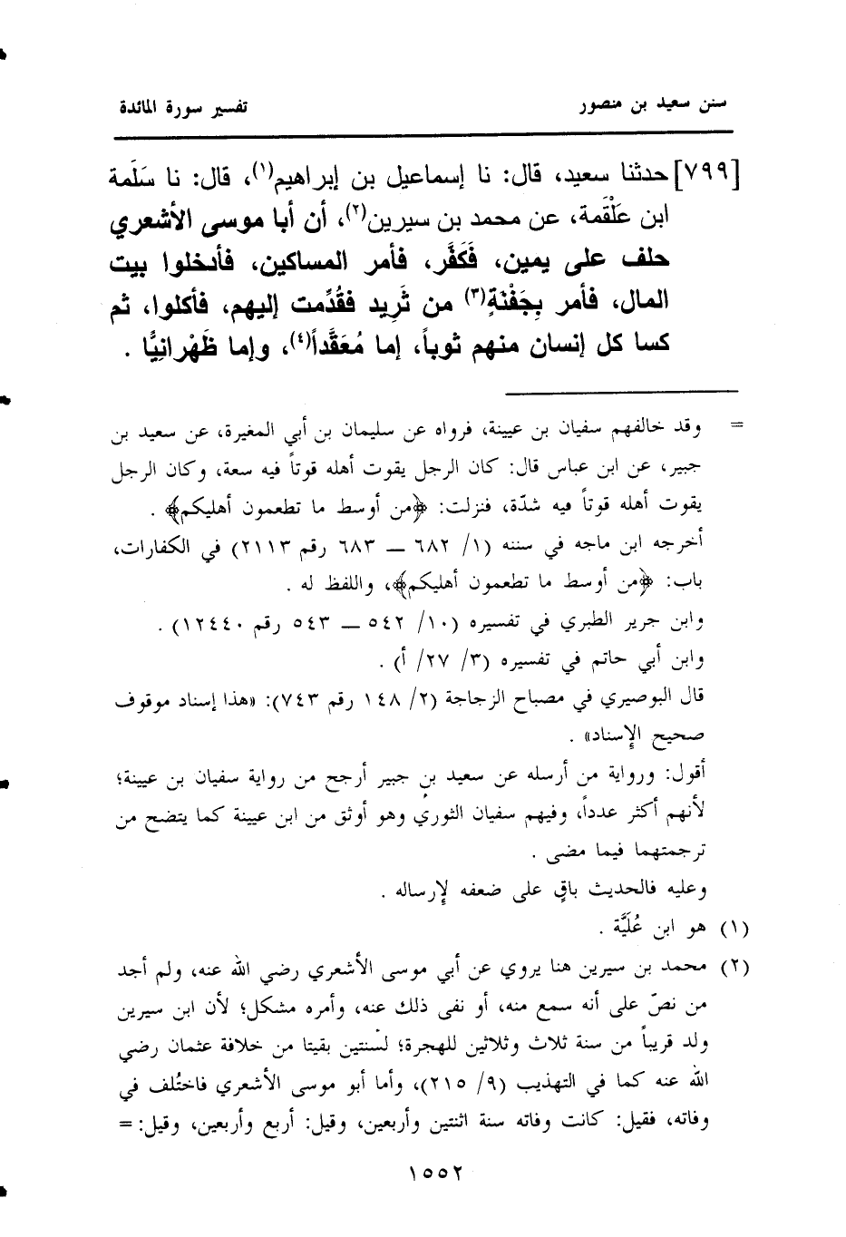 ٧٩٩ - حَدَّثَنَا سَعِيدٌ، قَالَ: نا إِسْمَاعِيلُ بْنُ إِبْرَاهِيمَ (¬١)، قَالَ: نَا سَلَمة بْنُ عَلْقَمة، عَنْ مُحَمَّدِ بْنِ سِيرِينَ (¬٢)، أَنَّ أَبَا مُوسَى الْأَشْعَرِيَّ، حَلَفَ عَلَى يَمِينٍ، فَكَفَّر، فَأَمَرَ الْمَسَاكِينَ، فَأُدْخِلُوا بَيْتَ الْمَالِ، فَأَمَرَ بِجَفْنَةٍ (¬٣) مِنْ ثَرِيد فقُدِّمت إِلَيْهِمْ، فَأَكَلُوا، ثُمَّ كَسَا كُلَّ إِنْسَانٍ مِنْهُمْ ثَوْبًا، إِمَّا مُعَقَّدًا (¬٤)، وَإِمَّا ظَهْرانِيًّا.