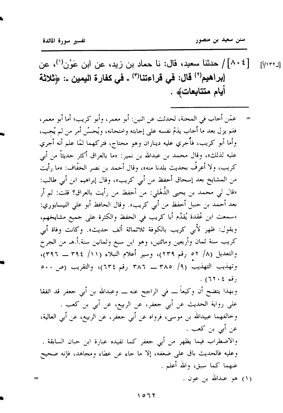 ٨٠٤ - [ل ١٣٢/أ] حَدَّثَنَا سَعِيدٌ، قَالَ: نا حَمَّادُ بْنُ زَيْدٍ، عَنِ ابْنِ عَوْن (¬١)، عَنْ إِبْرَاهِيمَ (¬٢) قَالَ: فِي قِرَاءَتِنَا (¬٣) - فِي كَفَّارَةِ الْيَمِينِ - {ثَلَاثَةِ أَيَّامٍ متتابعات}.