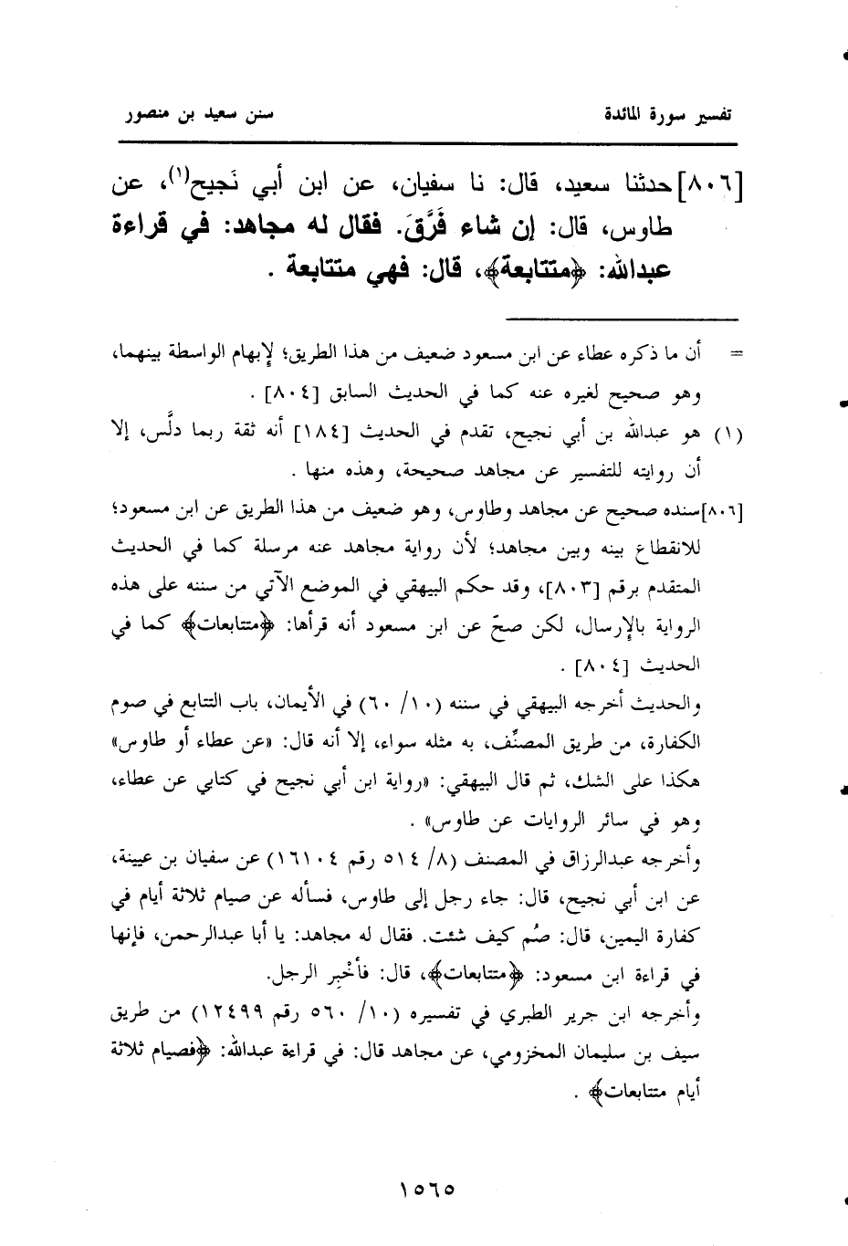 ٨٠٦ - حَدَّثَنَا سَعِيدٌ، قَالَ: نا سُفْيَانُ، عَنِ ابْنِ أَبِي نَجيح (¬١)، عَنْ طَاوُسٍ، قَالَ: إِنْ شَاءَ فَرَّقَ. فَقَالَ لَهُ مُجَاهِدٌ: فِي قِرَاءَةِ عَبْدِ اللَّهِ: {مُتَتَابِعَةً}، قَالَ: فَهِيَ متتابعة.