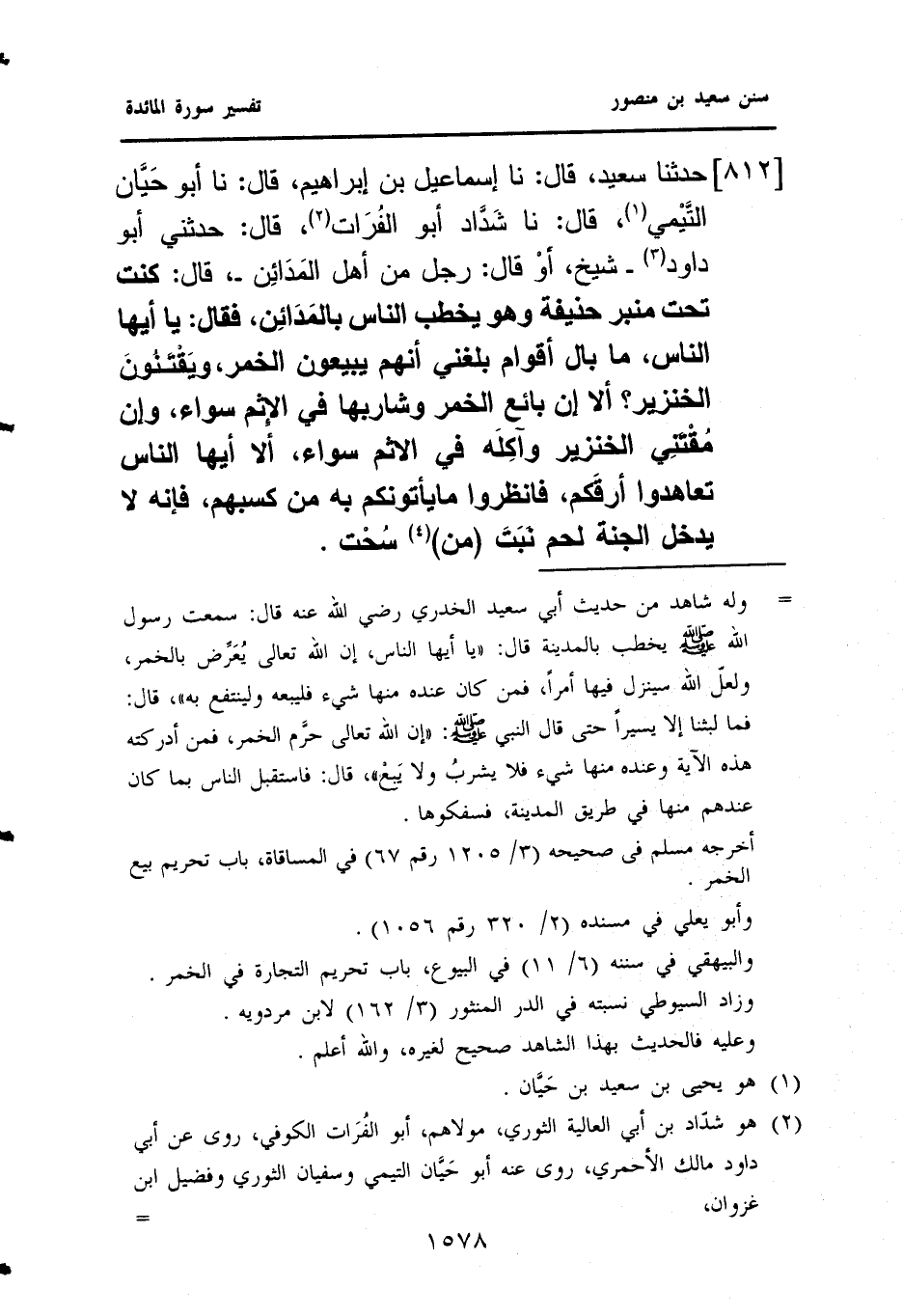 ٨١٢ - حَدَّثَنَا سَعِيدٌ، قَالَ: نا إِسْمَاعِيلُ بْنُ إِبْرَاهِيمَ، قَالَ: نَا أَبُو حَيَّان التَّيْمي (¬١)، قَالَ: نا شَدَّاد أَبُو الفُرَات (¬٢)، قَالَ: حَدَّثَنِي أَبُو دَاوُدَ (¬٣) - شَيْخٌ، أوْ قَالَ: رَجُلٌ مِنْ أَهْلِ المَدَائِن -، قَالَ: كُنْتُ تَحْتَ مِنْبَرِ حُذَيْفَةَ وَهُوَ يَخْطُبُ النَّاسَ بالمَدَائِن، فَقَالَ: يَا أَيُّهَا النَّاسُ، مَا بَالُ أَقْوَامٍ بَلَغَنِي أَنَّهُمْ يَبِيعُونَ الْخَمْرَ، ويَقْتَنُونَ الْخِنْزِيرَ؟ أَلَا إِنَّ بَائِعَ الْخَمْرِ وَشَارِبَهَا فِي الْإِثْمِ سَوَاءٌ، وَإِنَّ مُقْتَنِي الْخِنْزِيرِ وآكِلَه فِي الْإِثْمِ سَوَاءٌ، أَلَا أَيُّهَا النَّاسُ تَعَاهَدُوا أرقَكم، فَانْظُرُوا مَا يَأْتُونَكُمْ بِهِ مِنْ كَسْبِهِمْ، فَإِنَّهُ لَا يَدْخُلُ الْجَنَّةَ لحم نَبَتَ (من) (¬٤) سُحْت.