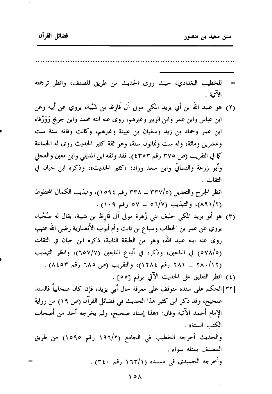 (¬٢) هو عُبَيْدِ اللَّهِ بْنِ أَبِي يَزِيدَ المكي مولى آل قَارِظ بن شَيْبة، يروي عن أبيه وعن ابن عباس وابن عمر وابن الزبير وغيرهم، روى عنه ابنه محمد وابن جريج وَوَرْقاء بن عمر وحماد بن زيد وسفيان بن عيينة وغيرهم، وكانت وفاته سنة ست وعشرين ومائة، وله ست وثمانون سنة، وهو ثقة كثير الحديث روى له الجماعة كما في "التقريب" (ص ٣٧٥ رقم ٤٣٥٣). فقد وثقه ابن المديني وابن معين والعجلي وأبو زرعة والنسائي وابن سعد وزاد: ((كثير الحديث))، وذكره ابن حبان في "الثقات".