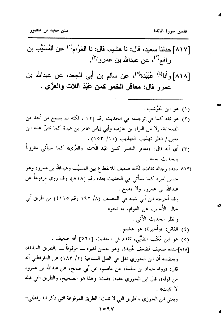 ٨١٧ - حَدَّثَنَا سَعِيدٌ، قَالَ: نا هُشَيْمٌ، قَالَ: نا العَوَّام (¬١)، عَنِ المُسَيَّب بْنِ رَافِعٍ (¬٢)، عَنْ عَبْدِ اللَّهِ بْنِ عَمْرٍو (¬٣).