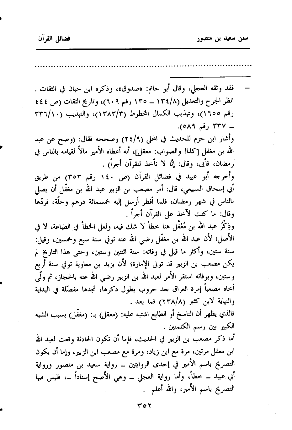 أما ذكر مصعب بن الزبير في الحديث، فإما أن تكون الحادثة وقعت لعبد الله بن معقل مرتين، مرة مع ابن زياد، ومرة مع مصعب بن الزبير، وإما أن يكون التصريح باسم الأمير في إحدى الروايتين - رواية سعيد بن منصور ورواية أبي عبيد - خطأ، وأما رواية العجلي - وهي الأصح إسنادًا -، فليس فيها التصريح باسم الأمير، والله أعلم.
