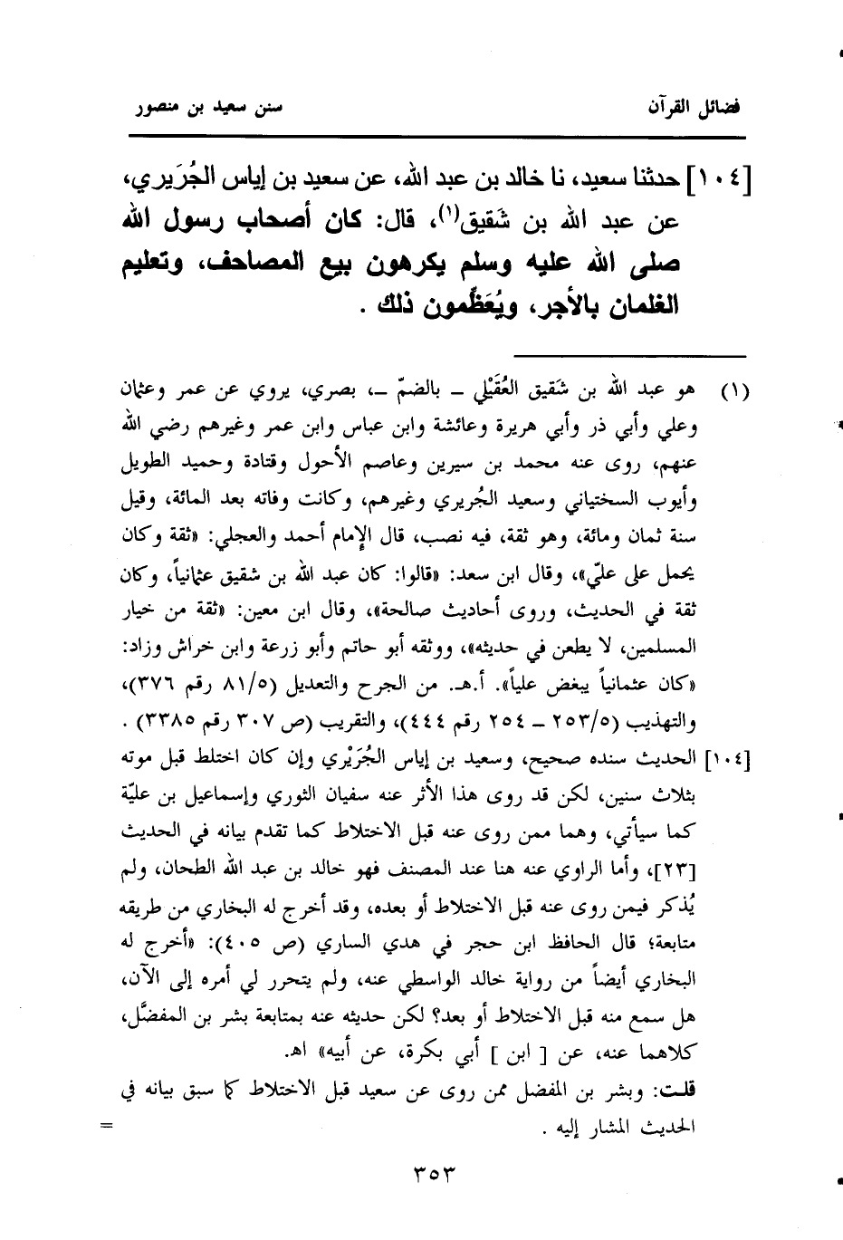 ١٠٤ - حَدَّثَنَا سَعِيدٌ، قَالَ: نا خَالِدُ بْنُ عَبْدِ اللَّهِ، عَنْ سَعِيدِ بْنِ إِيَاسٍ الجُرَيري، عَنْ عَبْدِ اللَّهِ بْنِ شَقيق (¬١)، قَالَ: كَانَ أَصْحَابُ رَسُولِ اللَّهِ صَلَّى اللهُ عَلَيْهِ وَسَلَّمَ يَكْرَهُونَ بَيْعَ الْمَصَاحِفِ، وَتَعْلِيمَ الْغِلْمَانِ بِالْأَجْرِ، ويُعَظِّمون ذَلِكَ.