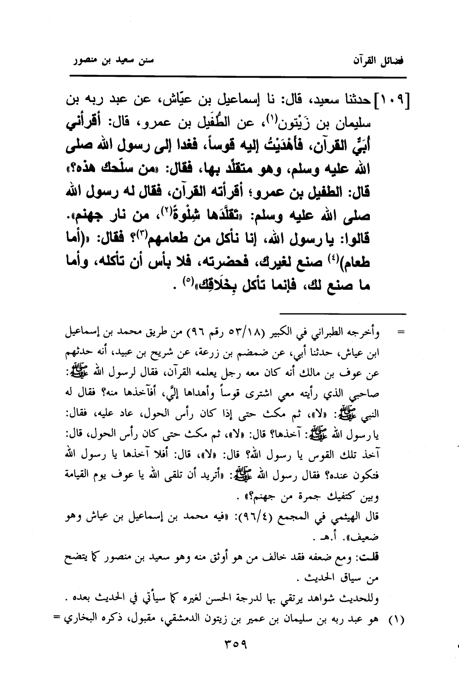 ١٠٩ - حَدَّثَنَا سَعِيدٌ، قَالَ: نا إِسْمَاعِيلُ بْنُ عَيَّاشٍ، عَنْ عَبْدِ رَبِّهِ بْنِ سُلَيْمَانَ بْنِ زَيْتون (¬١)، عَنِ الطُّفَيل بْنِ عَمْرٍو، قَالَ: أَقْرَأَنِي أُبَيٌّ الْقُرْآنَ، فأَهْدَيْتُ إِلَيْهِ قَوْسًا، فَغَدَا إِلَى رَسُولِ اللَّهِ صَلَّى اللهُ عَلَيْهِ وَسَلَّمَ، وَهُوَ متقلِّد بِهَا، فَقَالَ: ((مَنْ سَلَّحَكَ هَذِهِ؟)). قَالَ: الطُّفَيْلُ بْنُ عَمْرٍو؛ أَقْرَأْتُهُ الْقُرْآنَ، فَقَالَ لَهُ رَسُولُ اللَّهِ صَلَّى اللهُ عَلَيْهِ وَسَلَّمَ: ((تَقَلَّدَها شِلْوةً (¬٢) مِنْ نَارِ جَهَنَّمَ)). قَالُوا: يَا رَسُولَ اللَّهِ، إِنَّا نَأْكُلُ مِنْ طَعَامِهِمْ (¬٣)؟ فَقَالَ: (((أَمَا طَعَامٌ) (¬٤) صُنِعَ لِغَيْرِكَ، فَحَضَرْتَهُ، فَلَا بَأْسَ أَنْ تَأْكُلَهُ، وَأَمَا مَا صُنِعَ لك، فإنما تأكل بِخَلَاقِك)) (¬٥).