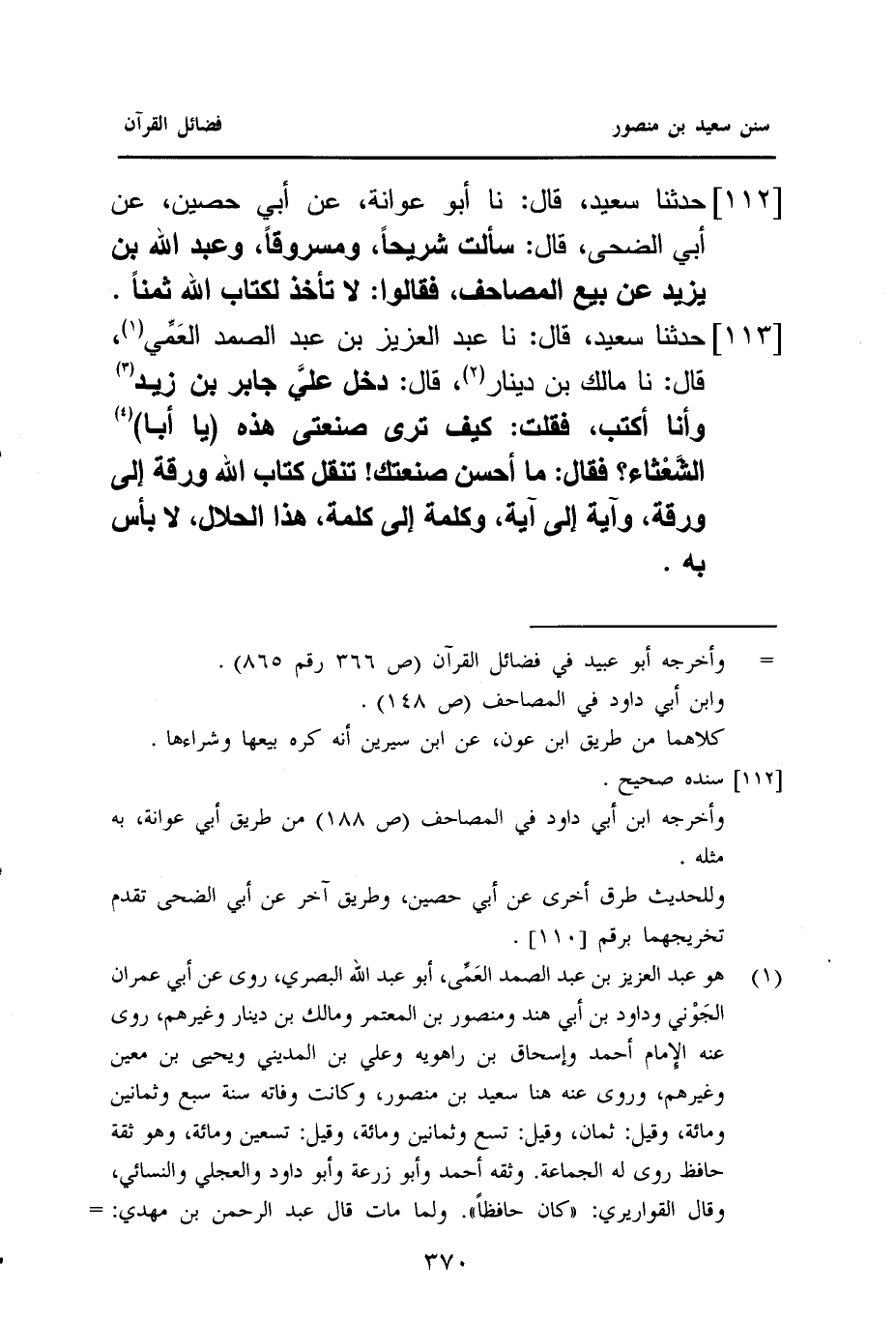١١٢ - حَدَّثَنَا سَعِيدٌ، قَالَ: نا أَبُو عَوَانَةَ، عَنْ أَبِي حَصِينٍ، عَنْ أَبِي الضُّحَى، قَالَ: سَأَلْتُ شُرَيْحًا، وَمَسْرُوقًا، وَعَبْدَ اللَّهِ بْنَ يَزِيدَ عَنْ بَيْعِ الْمَصَاحِفِ، فَقَالُوا: لَا تَأْخُذْ لِكِتَابِ اللَّهِ ثَمَنًا.