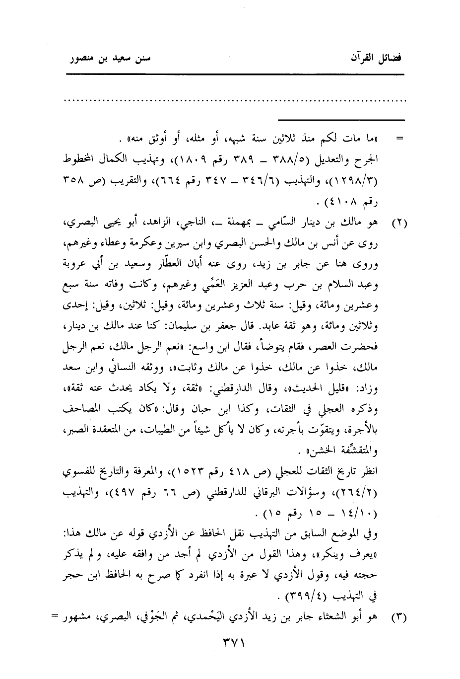 (¬٢) هو مالك بن دينار السّامي - بمهملة -، الناجي، الزاهد، أبو يحيى البصري، روى عن أنس بن مالك والحسن البصري وابن سيرين وعكرمة وعطاء وغيرهم، وروى هنا عن جابر بن زيد، روى عنه أبان العطّار وسعيد بن أبي عروبة وعبد السلام بن حرب وعبد العزيز العَمِّي وغيرهم، وكانت وفاته سنة سبع وعشرين ومائة، وقيل: سنة ثلاث وعشرين ومائة، وقيل: ثلاثين، وقيل: إحدى وثلاثين ومائة، وهو ثقة عابد. قال جعفر بن سليمان: كنا عند مالك بن دينار، فحضرت العصر، فقام يتوضأ، فقال ابن واسع: ((نعم الرجل مالك، نعم الرجل مالك، خذوا عن مالك، خذوا عن مالك وثابت))، ووثقه النسائي وابن سعد وزاد: ((قليل الحديث))، وقال الدارقطني: ((ثقة، ولا يكاد يحدث عنه ثقة))، وذكره العجلي في الثقات، وكذا ابن حبان وقال: ((كان يكتب المصاحف بالأجرة، ويتقوّت بأجرته، وكان لا يأكل شيئًا من الطيبات، من المتعقدة الصبر، والمتقشِّفة الخشن)).