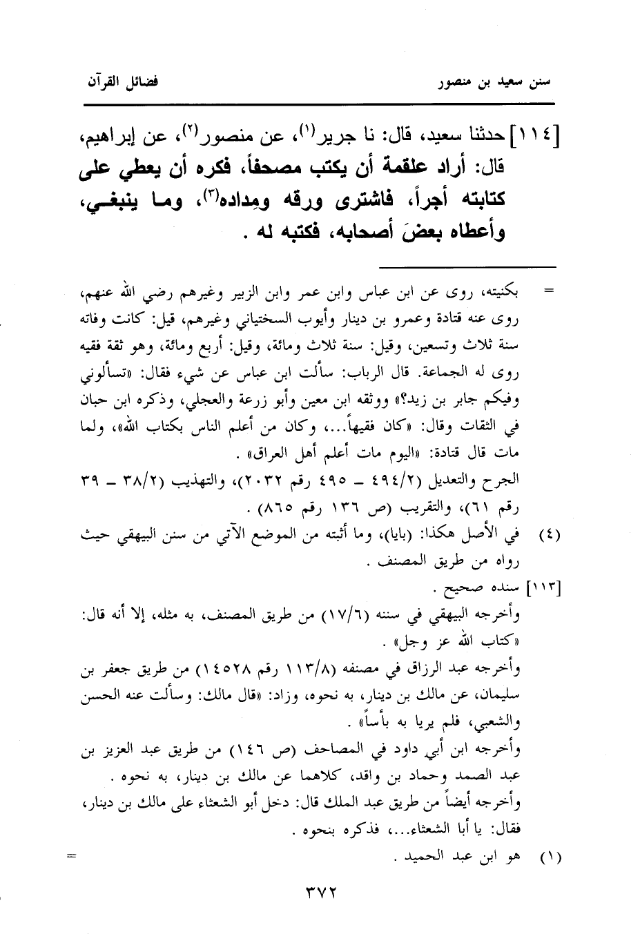 ١١٤ - حَدَّثَنَا سَعِيدٌ، قَالَ: نا جَرِيرٌ (¬١)، عَنْ مَنْصُورٍ (¬٢)، عَنْ إِبْرَاهِيمَ، قَالَ: أَرَادَ عَلْقَمَةُ أَنْ يَكْتُبَ مُصْحَفًا، فَكَرِهَ أَنْ يُعْطِيَ عَلَى كِتَابَتِهِ أَجْرًا، فَاشْتَرَى وَرَقَهُ ومِداده (¬١)، وَمَا يَنْبَغِي، وَأَعْطَاهُ بعضَ أَصْحَابِهِ، فَكَتَبَهُ له.