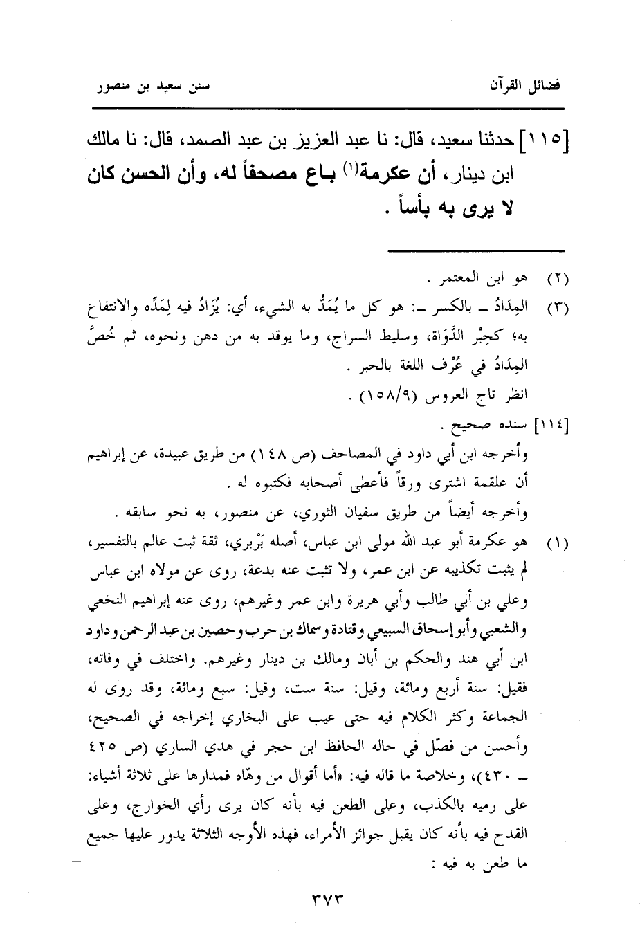 ١١٥ - حَدَّثَنَا سَعِيدٌ، قَالَ: نا عَبْدُ الْعَزِيزِ بْنُ عَبْدِ الصَّمَدِ، قَالَ: نا مَالِكُ بْنُ دِينَارٍ، أَنَّ عِكْرِمَةَ (¬١): بَاعَ مُصْحَفًا لَهُ، وَأَنَّ الْحَسَنَ كَانَ لَا يَرَى بِهِ بأسًا.