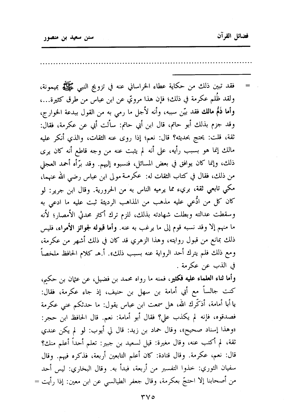 = فقد تبين ذلك من حكاية عطاء الخراساني عنه في تزويج النَّبِيِّ - صَلَّى اللهُ عَلَيْهِ وَسَلَّمَ - بميمونة، ولقد ظُلم عكرمة في ذلك، فإن هذا مرويّ عن ابن عباس من طرق كثيرة ... ، وأما ذَمُّ مالك فقد بيّن سببه، وأنه لأجل ما رمي به من القول ببدعة الخوراج، وقد جزم بذلك أبو حاتم، قال ابن أبي حاتم: سألت أبي عن عكرمة، فقال: ثقة: قلت: يحتج بحديثه؟ قال: نعم؛ إذا روى عنه الثقات، والذي أنكر عليه مالك إنما هو بسبب رأيه، على أنه لم يثبت عنه من وجه قاطع أنه كان يرى ذلك، وإنما كان يوافق في بعض المسائل، فنسبوه إليهم. وقد بّرأه أحمد العجلي من ذلك، فقال في "كتاب الثقات" له: عكرمة مولى ابْنِ عَبَّاسٍ رَضِيَ اللَّهُ عَنْهُمَا، مكي تابعي ثقة، بريء مما يرميه الناس به من الحرورية. وقال ابن جرير: لو كان كل من ادُّعي عليه مذهب من المذاهب الرديئة ثبت عليه ما ادعي به وسقطت عدالته وبطلت شهادته بذلك، للزم ترك أكثر محدثي الأمصار؛ لأنه ما منهم إلا وقد نسبه قوم إلى ما يرغب به عنه. وأما قبوله لجوائز الأمراء، فليس ذلك بمانع من قبول روايته، وهذا الزهري قد كان في ذلك أشهر من عكرمة، ومع ذلك فلم يترك أحد الرواية عنه بسبب ذلك)) . اهـ. كلام الحافظ ملخصًا في الذب عن عكرمة.