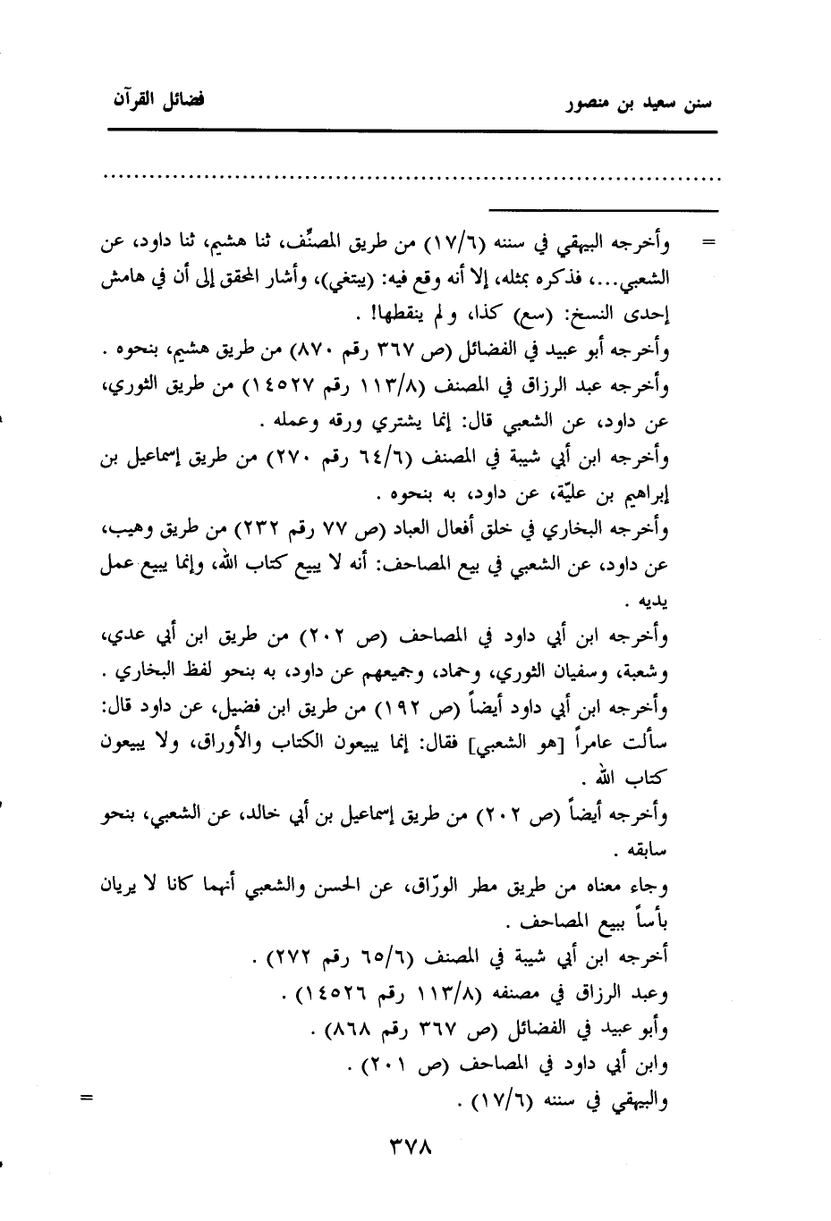 وأخرجه ابن أبي داود أيضًا (ص١٩٢) من طريق ابن فضيل، عن داود قال: سألت عامرًا [هو الشعبي] فقال: إنما يبيعون الكتاب والأوراق، ولا يبيعون كتاب الله.
