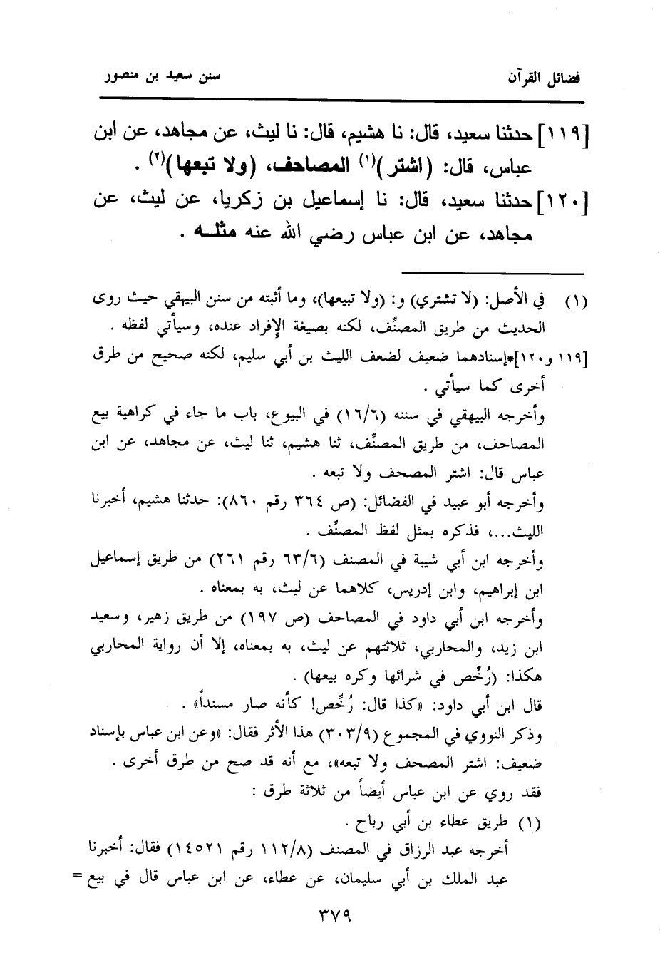١١٩ - حَدَّثَنَا سَعِيدٌ، قَالَ: نا هُشَيْمٌ، قَالَ: نا لَيْثٌ، عَنْ مُجَاهِدٍ، عَنِ ابْنِ عَبَّاسٍ قَالَ: (اشْتَرِ) (¬١) الْمَصَاحِفَ، (وَلَا تَبِعْهَا) (¬١).