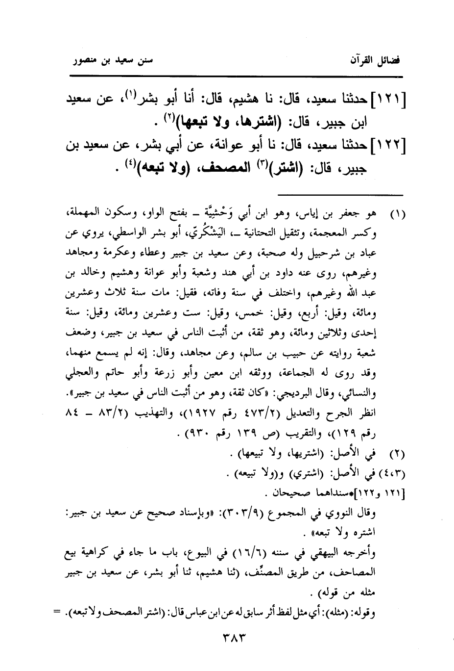 ١٢٢ - حَدَّثَنَا سَعِيدٌ، قَالَ: نا أَبُو عَوَانَةَ، عَنْ أَبِي بِشْرٍ، عَنْ سَعِيدِ بْنِ جُبَيْرٍ قَالَ: (اشْتَرِ) (¬٣) الْمُصْحَفَ، (وَلَا تَبِعْهُ) (¬٤).