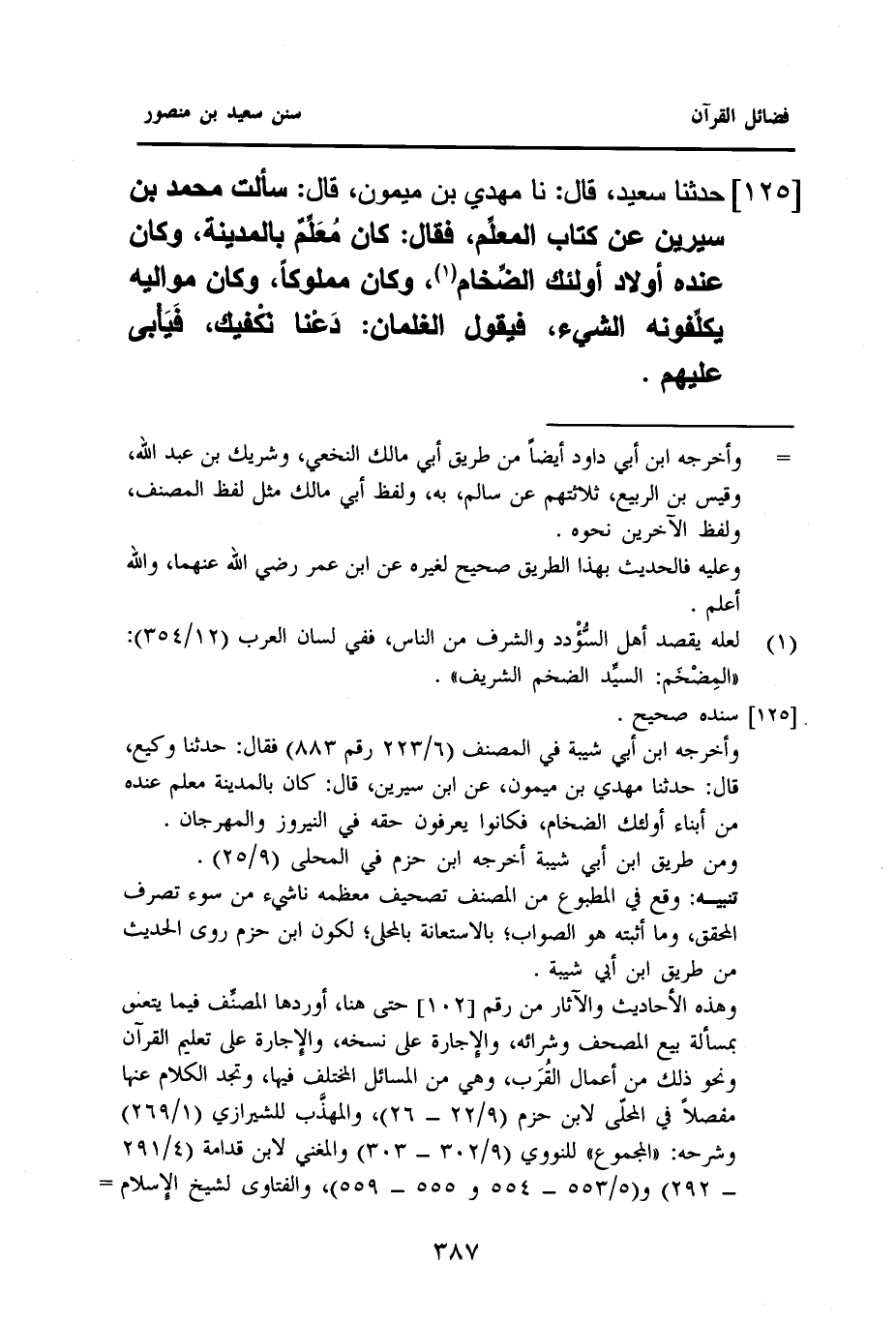 ١٢٥ - حَدَّثَنَا سَعِيدٌ، قَالَ: نا مَهْدِيُّ بْنُ مَيْمُونٍ، قَالَ: سَأَلْتُ مُحَمَّدَ بْنَ سِيرِينَ عَنْ كِتَابِ المعلِّم، فَقَالَ: كَانَ مُعَلِّمٌ بِالْمَدِينَةِ، وَكَانَ عِنْدَهُ أَوْلَادُ أُولَئِكَ الضِّخام (¬١)، وَكَانَ مَمْلُوكًا، وَكَانَ مَوَالِيهِ يكلِّفونه الشَّيْءَ، فَيَقُولُ الْغِلْمَانُ: دَعْنا نَكْفيك، فَيَأْبى عليهم.