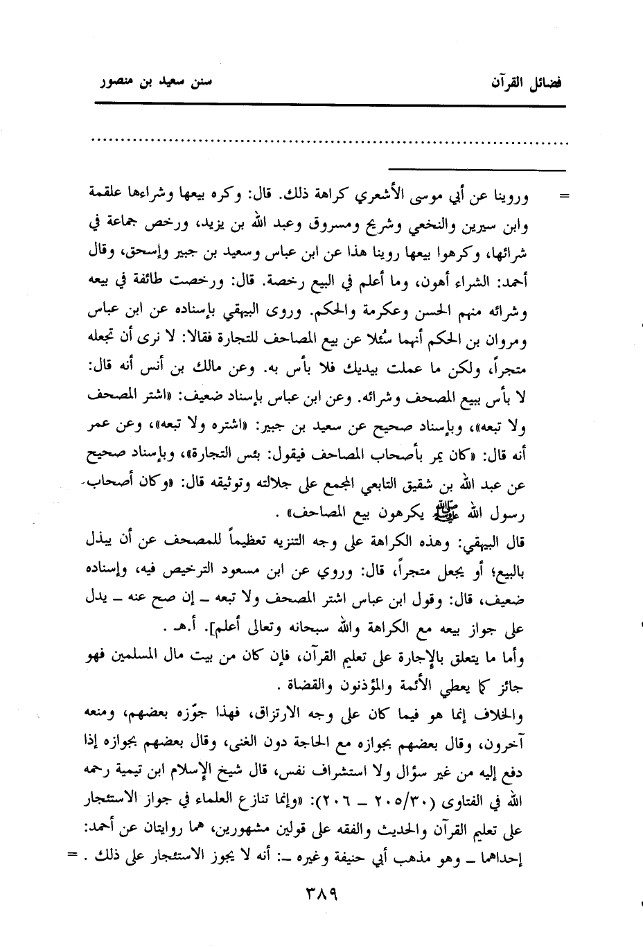 = وروينا عن أبي موسى الأشعري كراهة ذلك. قال: وكره بيعها وشراءها علقمة وابن سيرين والنخعي وشريح ومسروق وعبد الله بن يزيد، ورخص جماعة في شرائها، وكرهوا بيعها روينا هذا عن ابن عباس وسعيد بن جبير وإسحاق، وقال أحمد: الشراء أهون، وما أعلم في البيع رخصة. قال: ورخصت طائفة في بيعه وشرائه منهم الحسن وعكرمة والحكم. وروى البيهقي بإسناده عن ابن عباس ومروان بن الحكم أنها سُئلا عن بيع المصاحف للتجارة فقالا: لا نرى أن تجعله متجرًا، ولكن ما علمت بيديك فلا بأس به. وعن مالك بن أنس أنه قال: لا بأس ببيع المصحف وشرائه. وعن ابن عباس بإسناد ضعيف: ((اشتر المصحف ولا تبعه)) ، وبإسناد صحيح عن سعيد بن جبير: ((اشتره ولا تبعه)) ، وعن عمر أنه قال: ((كان يمر بأصحاب المصاحف فيقول: بئس التجارة)) ، وبإسناد صحيح عَنْ عَبْدِ اللَّهِ بْنِ شَقِيقٍ التابعي المجمع على جلالته وتوثيقه قال: ((وكان أَصْحَابُ رَسُولِ اللَّهِ - صَلَّى اللهُ عَلَيْهِ وَسَلَّمَ - يَكْرَهُونَ بَيْعَ الْمَصَاحِفِ)) .