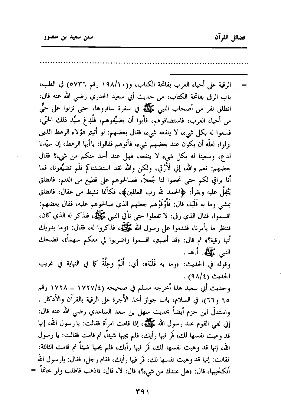 = الرقية على أحياء العرب بفاتحة الكتاب، و (١٠ / ١٩٨ رقم ٥٧٣٦) في الطب، باب الرقى بفاتحة الكتاب، من حديث أبي سعيد الخدري - رضي الله عنه - قال: انطلق نفر مِنْ أَصْحَابِ النَّبِيِّ صَلَّى اللهُ عليه وسلم في سفرة سافروها، حتى نزلوا على حيٍّ من أحياء العرب، فاستضافوهم فأبوا أن يضيِّفوهم، فلُدِغ سيِّد ذلك الحيّ، فسعوا له بكل شيء، لا ينفعه شيء فقال بعضهم: لو أتيتم هؤلاء الرهط الذين نزلوا لعلّه أن يكون عند بعضهم شيء، فأتوهم فقالوا: يا أيها الرهط، إن سيّدنا لدغ وسعينا له بكل شيء لا ينفعه، فهل عند أحد منكم من شيء؟ فقال بعضهم: نعم والله، إني لأَرْقي، ولكن والله لقد استضفناكم فلَم تضيِّفونا فما أنا براقٍ لكم حتى تجعلوا لنا جُعلاً فصالحوهم على قطيع من الغنم، فانطلق يَتْفِلُ عليه ويقرأ: {الحمد لله رب العالمين} . فكأنما نشِط من عقال فانطلق يمشي وما به قَلَبَة، قال: فَأَوْفَوْهم جعلهم الذي صالحوهم عليه، فقال بعضهم: اقسموا فقال الذي رقى: لا تفعلوا حتى نأتي النبي صلى الله عليه وسلم فنذكر له الذي كان فننظر ما يأمرنا فقدموا عَلَى رَسُولِ اللَّهِ - صَلَّى اللهُ عليه وسلم - فذكروا له، فقال: ((وما يدريك أنها رقية؟)) . ثم قال: ((قد أصبتم اقسموا واضربوا لي معكم سهمًا)) ، فضحك النَّبِيِّ - صَلَّى اللهُ عَلَيْهِ وَسَلَّمَ -. اهـ.