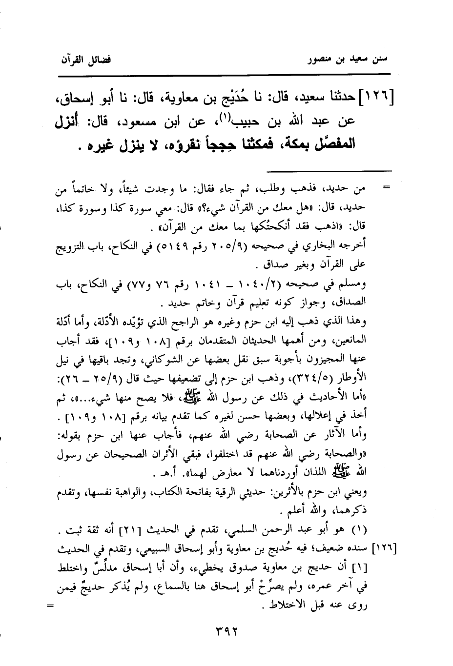 ١٢٦ - حَدَّثَنَا سَعِيدٌ، قَالَ: نا حُدَيْج بْنُ مُعَاوِيَةَ، قَالَ: نا أَبُو إِسْحَاقَ، عَنْ عَبْدِ اللَّهِ بْنِ حَبِيبٍ (¬١)، عَنِ ابْنِ مَسْعُودٍ، قَالَ: أُنزل المفصَّل بِمَكَّةَ، فَمَكَثْنَا حِججًا نقرؤه، لا ينزل غيره.