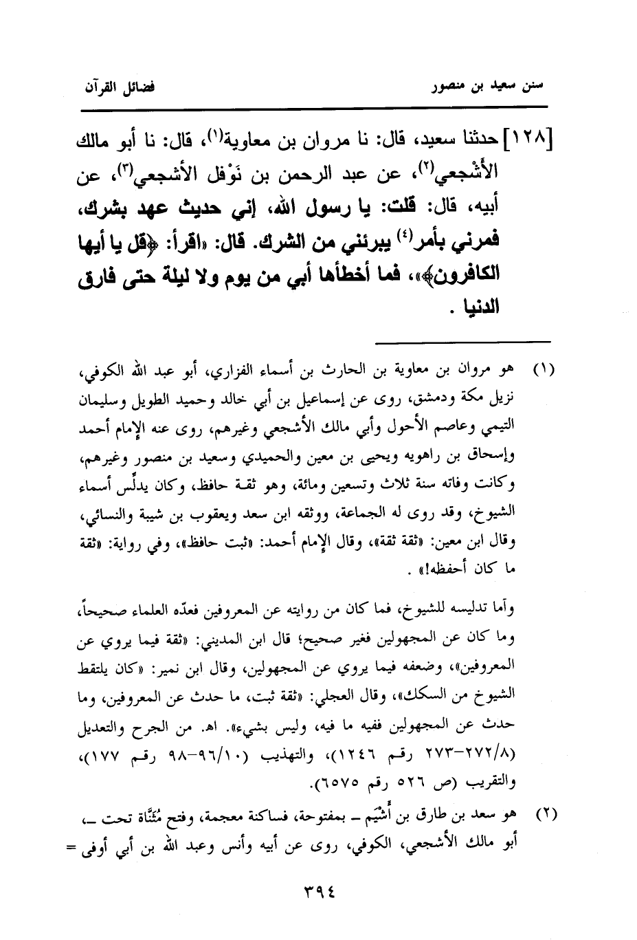 ١٢٨ - حَدَّثَنَا سَعِيدٌ، قَالَ: نا مَرْوَانُ بْنُ مُعَاوِيَةَ (¬١)، قَالَ: نا أَبُو مَالِكٍ الأَشْجعي (¬٢)، عَنْ عَبْدِ الرَّحْمَنِ بْنِ نَوْفل الْأَشْجَعِيِّ (¬٣)، عَنْ أَبِيهِ، قَالَ: قُلْتُ: يَا رَسُولَ اللَّهِ، إِنِّي حَدِيثُ عَهْدٍ بِشِرْكٍ، فَمُرْنِي بِأَمْرٍ (¬٤) يُبَرِّئُنِي مِنَ الشِّرْكِ. قَالَ: اقْرَأْ: {قُلْ يَا أَيُّهَا الكَافِرُونَ}، فَمَا أَخْطَأَهَا أَبِي مِنْ يَوْمٍ وَلَا لَيْلَةٍ حَتَّى فَارَقَ الدُّنْيَا.