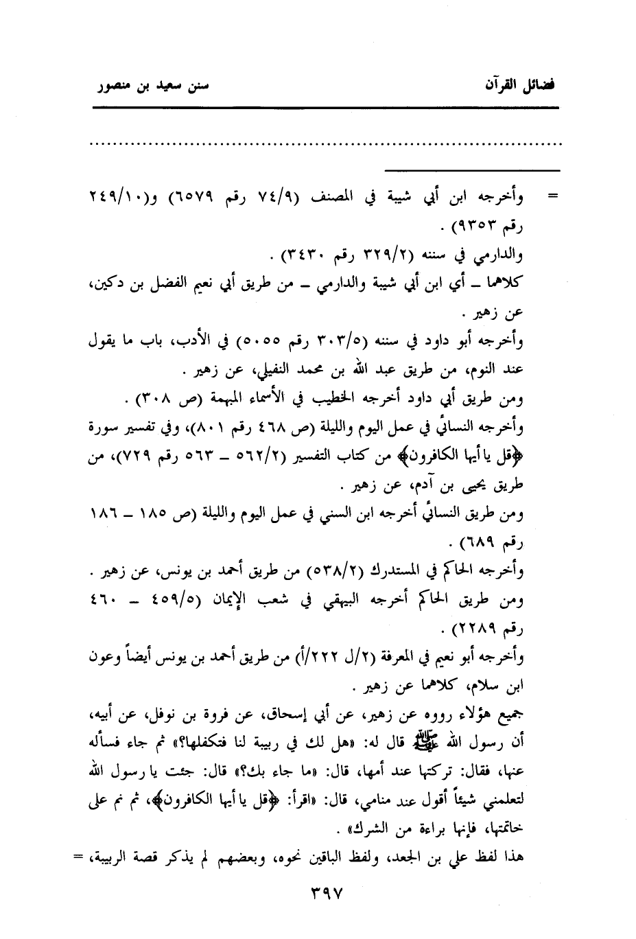 جميع هؤلاء رووه عن زهير، عن أبي إسحاق، عن فروة بن نوفل، عَنْ أَبِيهِ، أَنَّ رَسُولَ اللَّهِ - صَلَّى اللهُ عَلَيْهِ وَسَلَّمَ - قَالَ له: ((هل لك في ربيبة لنا فتكفلها؟)) ثم جاء فسأله عنها، فقال: تركتها عند أمها، قال: ((ما جاء بك؟)) قال: جئت يا رسول الله لتعلمني شيئًا أقول عند منامي، قَالَ: ((اقْرَأْ: {قُلْ يَا أَيُّهَا الكافرون} ، ثم من على خاتمتها، فإنها براءة من الشرك)) .