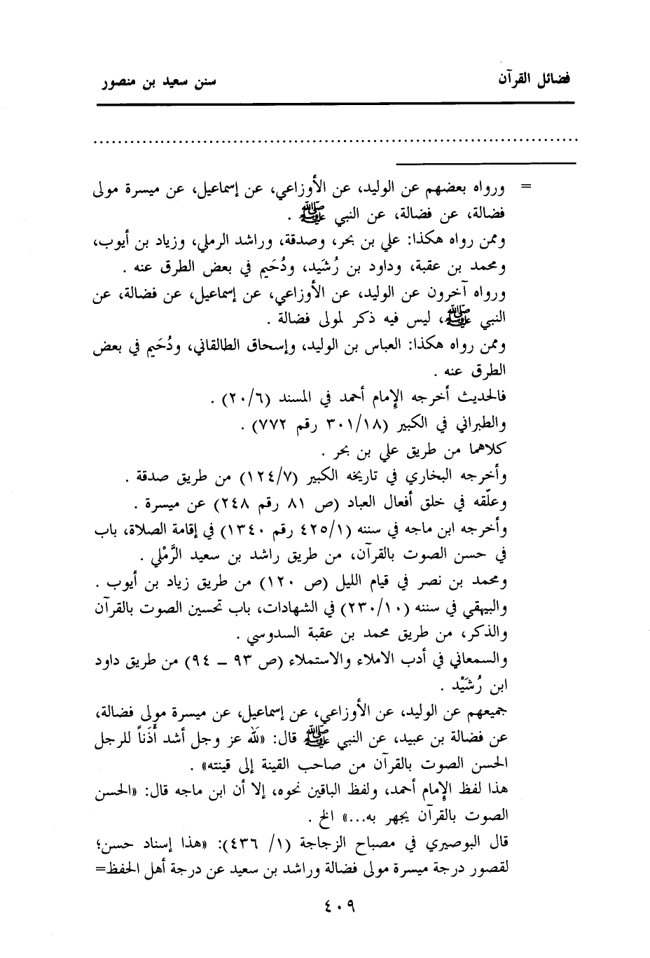 جميعهم عن الوليد، عن الأوزاعي، عن إسماعيل، عن ميسرة مولى فضالة، عن فضالة بن عبيد، عَنِ النَّبِيِّ - صَلَّى اللهُ عَلَيْهِ وسلم - قال: ((لَله عز وجل أشد أَذَنًا للرجل الْحَسَنِ الصَّوْتِ بِالْقُرْآنِ مِنْ صَاحِبِ القينة إلى قينته)) . هذا لفظ الإمام أحمد، ولفظ الباقين نحوه، إلا أن ابن ماجه قال: ((الحسن الصوت بالقرآن يجهر به ... )) إلخ.