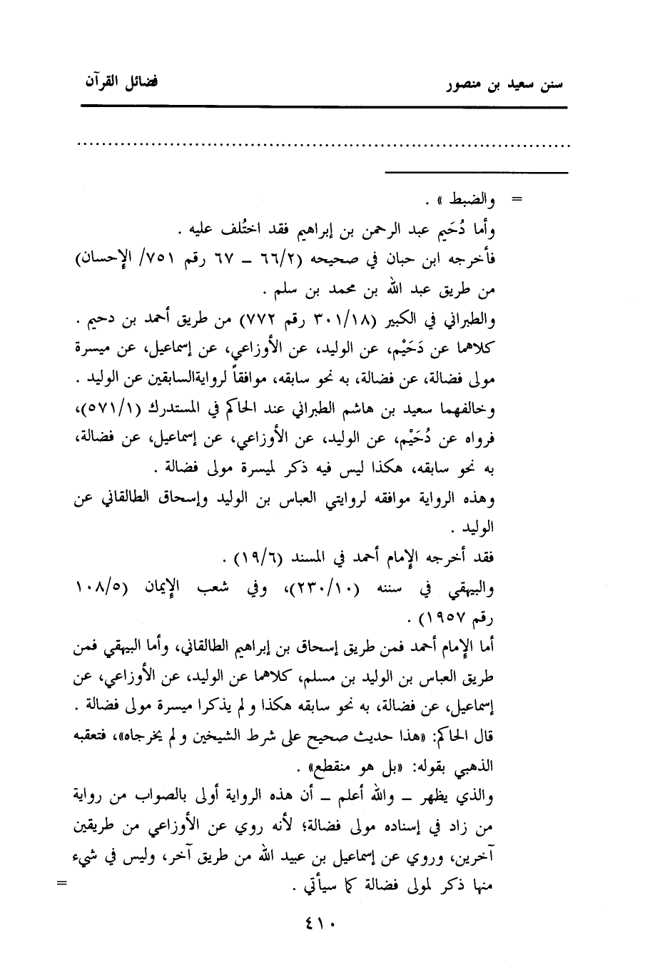 أما الإمام أحمد فمن طريق إسحاق بن إبراهيم الطالقاني، وأما البيهقي فمن طريق العباس بن الوليد بن مسلم، كلاهما عن الوليد، عن الأوزاعي، عن إسماعيل، عن فضالة، به نحو سابقه هكذا ولم يذكرا ميسرة مولى فضالة.