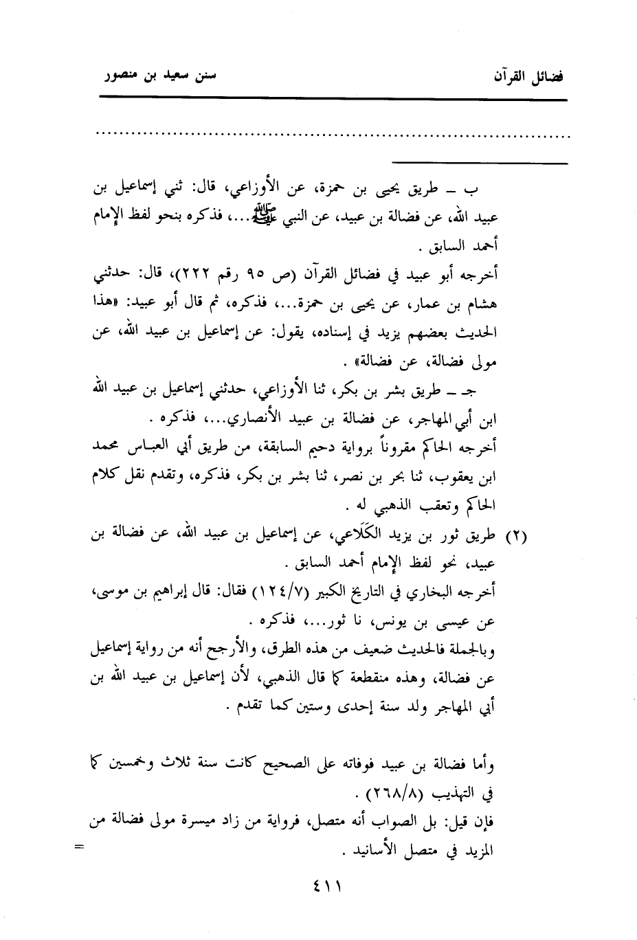 أخرجه أبو عبيد في "فضائل القرآن" (ص ٩٥ رقم ٢٢٢)، قال: حدثني هشام بن عمار، عن يحيى بن حمزة ... ، فذكره، ثم قال أبو عبيد: ((هذا الحديث بعضهم يزيد في إسناده، يقول: عَنْ إِسْمَاعِيلَ بْنِ عُبَيْدِ اللَّهِ، عن مولى فضالة، عن فضالة)).