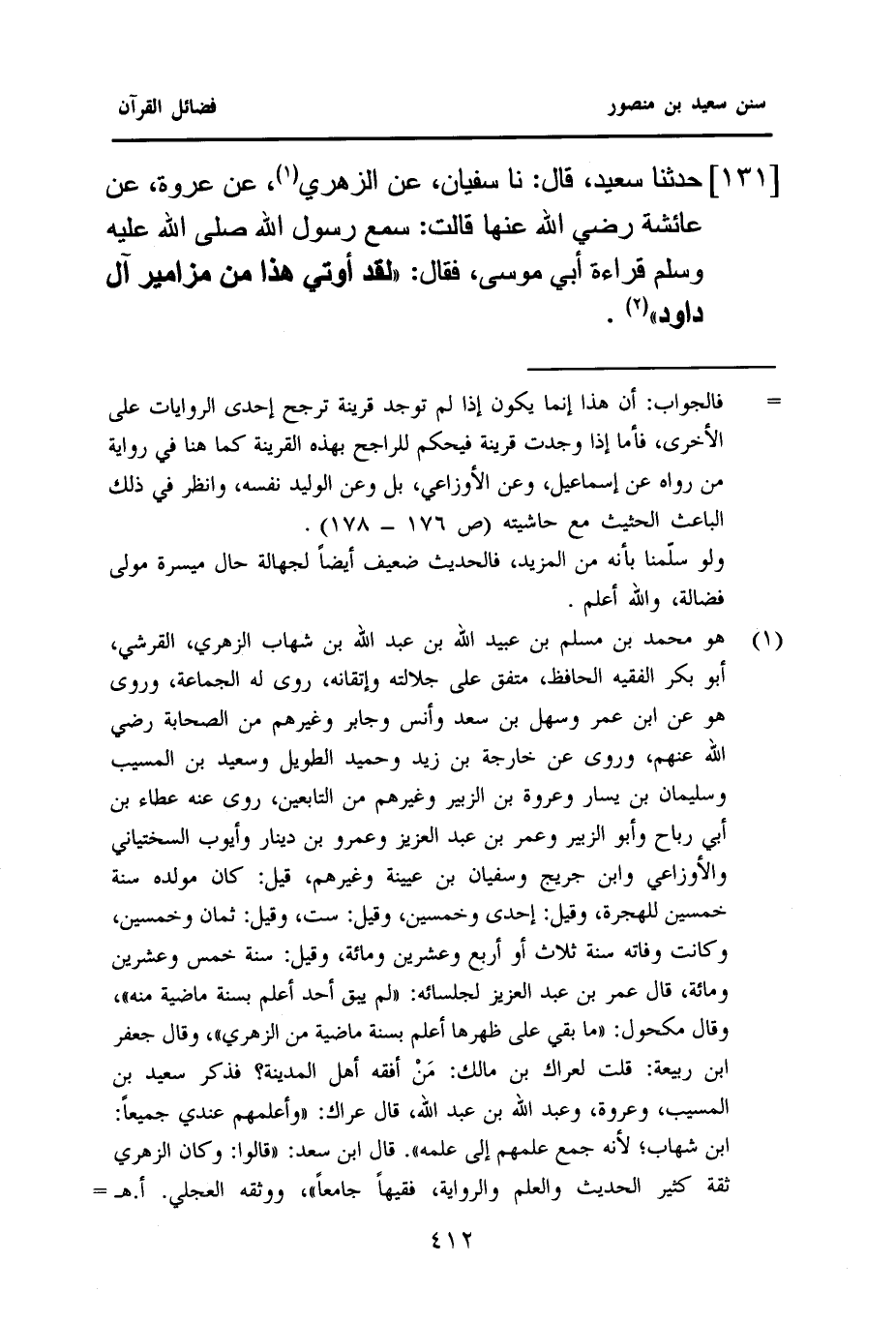 ١٣١ - حَدَّثَنَا سَعِيدٌ، قَالَ: نا سُفْيَانُ، عَنِ الزُّهْرِيِّ (¬١)، عَنْ عُرْوَةَ، عَنْ عَائِشَةَ رَضِيَ اللَّهُ عَنْهَا، قَالَتْ: سَمِعَ رَسُولُ اللَّهِ صَلَّى اللهُ عَلَيْهِ وَسَلَّمَ قِرَاءَةَ أَبِي مُوسَى، فَقَالَ: ((لَقَدْ أُوتِيَ هَذَا مِنْ مزامير آل داود)) (¬٢).