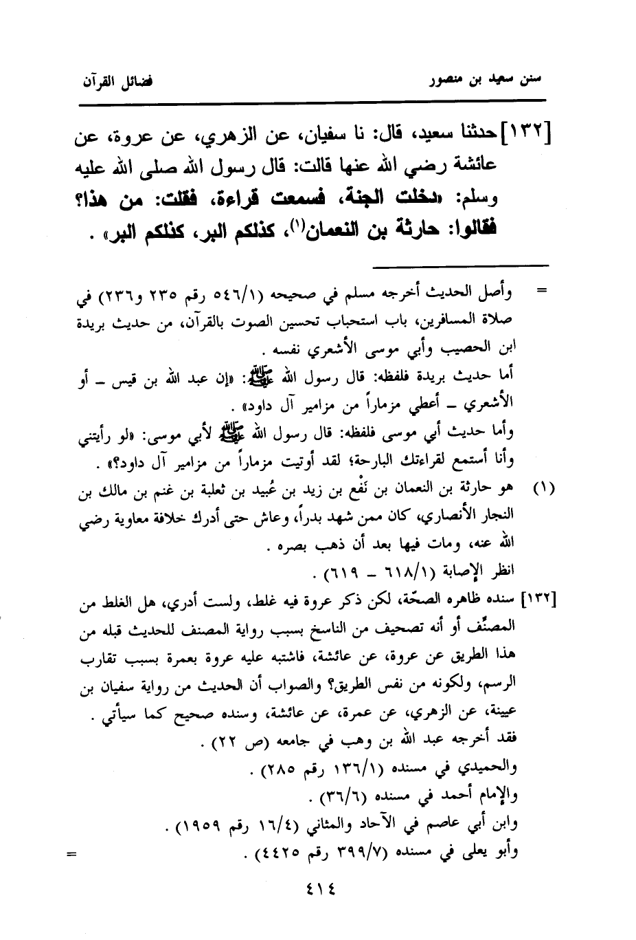١٣٢ - حَدَّثَنَا سَعِيدٌ، قَالَ: نا سُفْيَانُ، عَنِ الزُّهْرِيِّ، عَنْ عُرْوَةَ، عَنْ عَائِشَةَ رَضِيَ اللَّهُ عَنْهَا، قَالَتْ: قَالَ رَسُولُ اللَّهِ صَلَّى اللهُ عَلَيْهِ وَسَلَّمَ: ((دَخَلْتُ الْجَنَّةَ فَسَمِعْتُ قِرَاءَةً، فَقُلْتُ: مَنْ هَذَا؟ فَقَالُوا: حَارِثَةُ بْنُ النُّعْمَانِ (¬١)، كَذَلِكُمُ الْبِرُّ، كذلكم البر)).