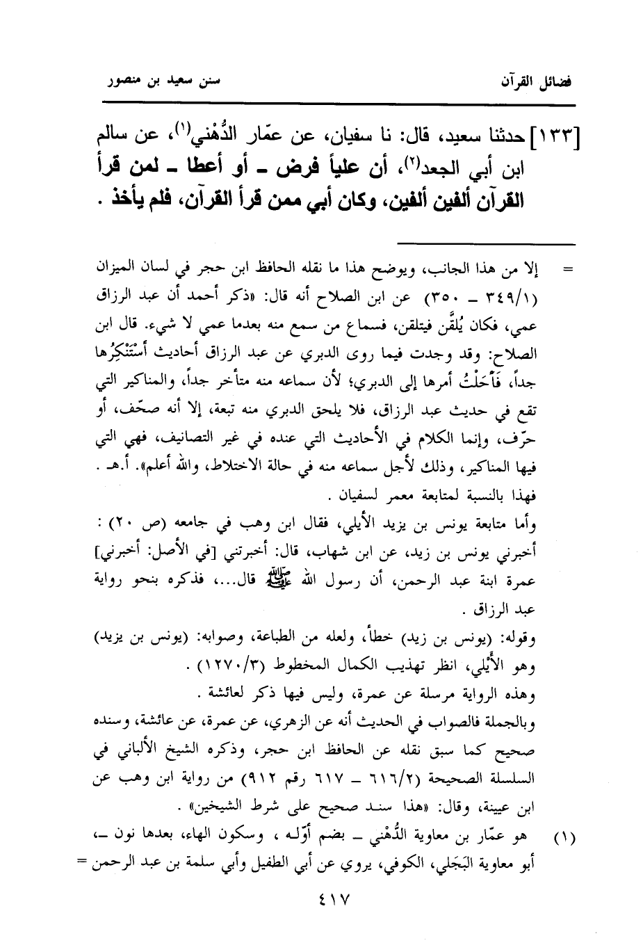 ١٣٣ - حَدَّثَنَا سَعِيدٌ، قَالَ: نا سُفْيَانُ، عَنْ عَمَّارٍ الدُّهْني (¬١)، عَنْ سَالِمِ بْنِ أَبِي الْجَعْدِ (¬٢)، أَنَّ عَلِيًّا فَرَضَ - أَوْ أَعْطَى - لِمَنْ قَرَأَ الْقُرْآنَ أَلْفَيْنِ أَلْفَيْنِ، وَكَانَ أَبِي مِمَّنْ قَرَأَ الْقُرْآنَ، فَلَمْ يَأْخُذْ.