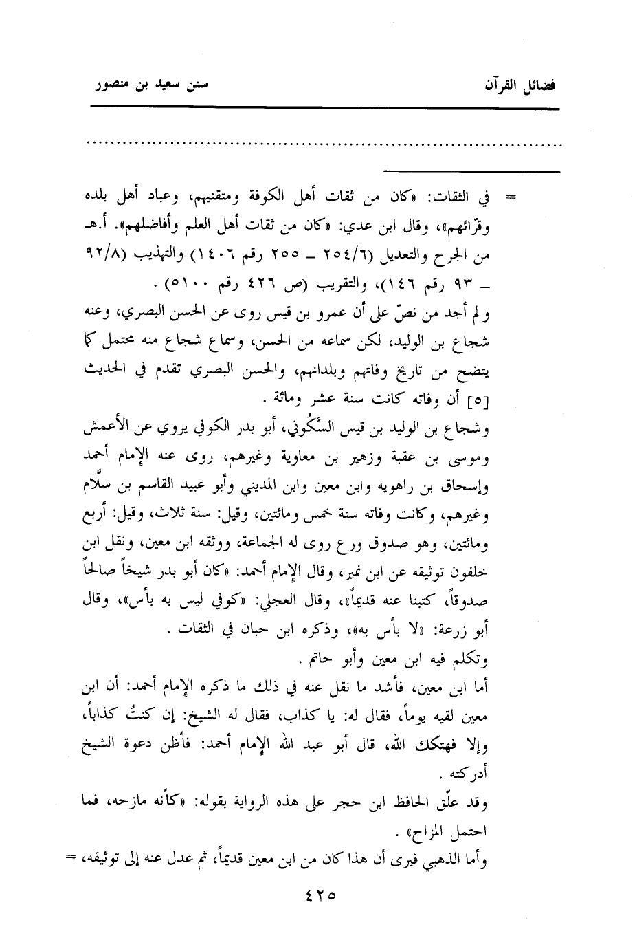وشجاع بن الوليد بن قيس السَّكُوني، أبو بدر الكوفي يروي عن الأعمش وموسى بن عقبة وزهير بن معاوية وغيرهم، روى عنه الإمام أحمد وإسحاق بن راهويه وابن معين وابن المديني وأبو عبيد القاسم بن سلام وغيرهم، وكانت وفاته سنة خمس ومائتين، وقيل: سنة ثلاث، وقيل: أربع ومائتين، وهو صدوق ورع روى له الجماعة، ووثقه ابن معين، ونقل ابن خلفون توثيقه عن ابن نمير، وقال الإمام أحمد: ((كان أبو بدر شيخًا صالحًا صدوقًا، كتبنا عنه قديمًا)) ، وقال العجلي: ((كوفي ليس به بأس)) ، وقال أبو زرعة: ((لا بأس به)) ، وذكره ابن حبان في "الثقات".