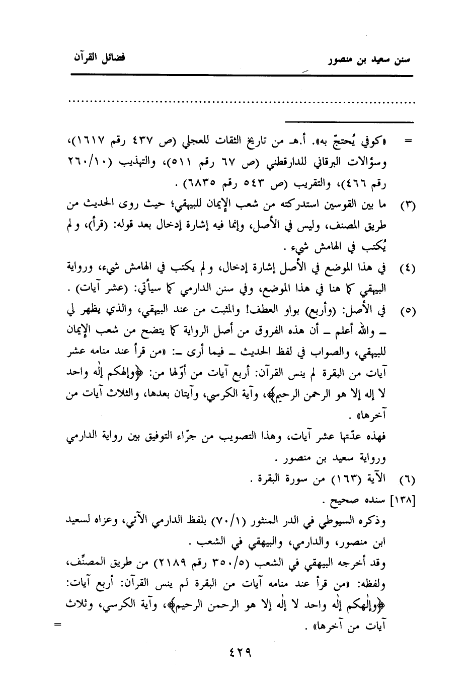 (¬٥) في الأصل: (وأربع) بواو العطف! والمثبت من عند البيهقي، والذي يظهر لي - والله أعلم - أن هذه الفروق من أصل الرواية كما يتضح من "شعب الإيمان" للبيهقي، والصواب في لفظ الحديث - فيما أرى -: ((من قرأ عند منامه عشر آيَاتٍ مِنَ الْبَقَرَةِ لَمْ يَنْسَ القرآن: أربع آيات من أوّلها مِنْ: {وَإِلَهُكُمْ إِلَهٌ وَاحِدٌ لَا إِلَهَ إِلَّا هُوَ الرَّحْمَنُ الرَّحِيمُ}، وآية الكرسي، وآيتان بعدها، والثلاث آيات من آخرها)).