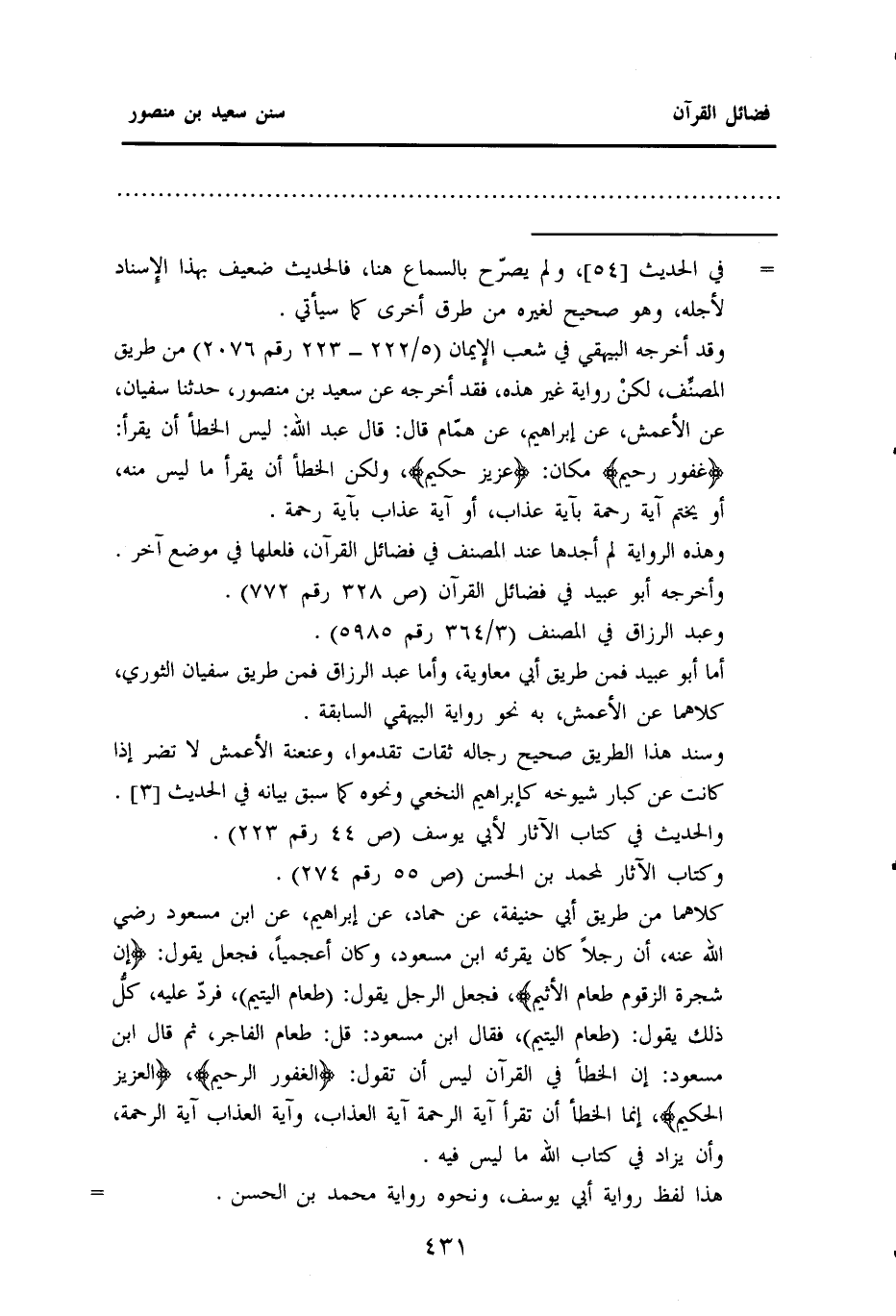 وقد أخرجه البيهقي في "شعب الإيمان" (٥ / ٢٢٢ - ٢٢٣ رقم ٢٠٧٦) من طريق المصنِّف، لكن رواية غير هذه، فقد أخرجه عن سعيد بن منصور، حدثنا سُفْيَانُ، عَنِ الْأَعْمَشِ، عَنْ إِبْرَاهِيمَ، عن همّام قَالَ: قَالَ عَبْدُ اللَّهِ: لَيْسَ الخطأ أن يقرأ: {غفور رحيم} مكان: {عزيز حكيم} ، ولكن الخطأ أن يقرأ ما ليس منه، أو يختم آية رحمة بآية عذاب، أو آية عذاب بآية رحمة.