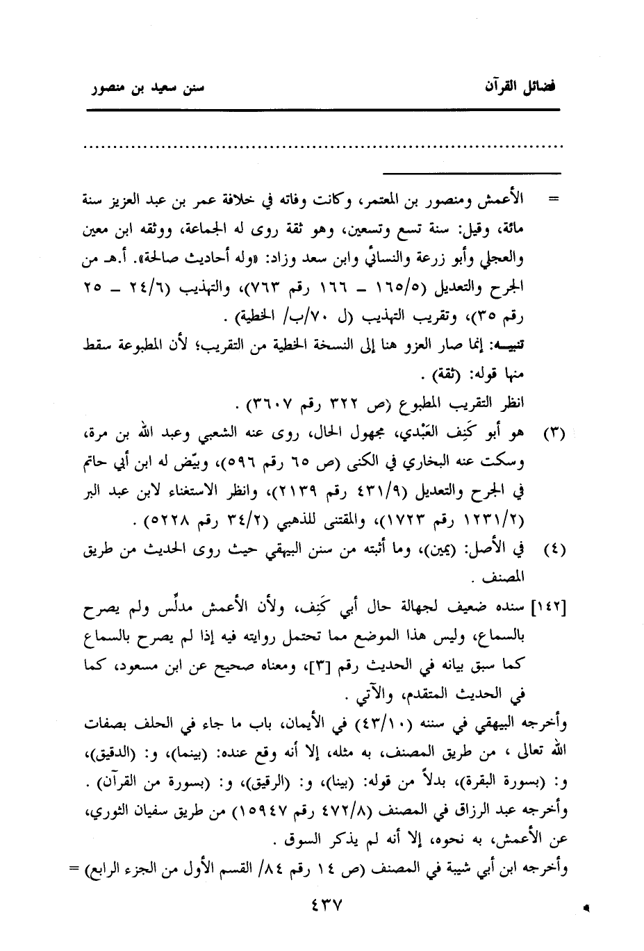 [١٤٢] سنده ضعيف لجهالة حال أبي كَنِف، ولأن الأعمش مدلِّس ولم يصرح بالسماع، وليس هذا الموضع مما تحتمل روايته فيه إذا لم يصرح بالسماع كما سبق بيانه في الحديث رقم [٣]، ومعناه صحيح عن ابن مسعود، كما في الحديث المتقدم، والآتي.