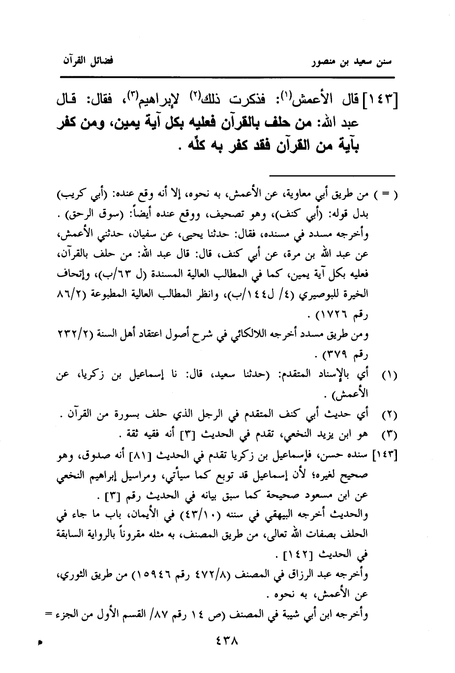 ١٤٣ - قَالَ الْأَعْمَشُ (¬١): فَذَكَرْتُ ذَلِكَ (¬٢) لِإِبْرَاهِيمَ (¬٣)، فَقَالَ: قَالَ عَبْدُ اللَّهِ: مَنْ حَلَفَ بِالْقُرْآنِ فَعَلَيْهِ بِكُلِّ آيَةٍ يَمِينٌ، وَمَنْ كَفَرَ بِآيَةٍ مِنَ الْقُرْآنِ فَقَدْ كَفَرَ بِهِ كلِّه.