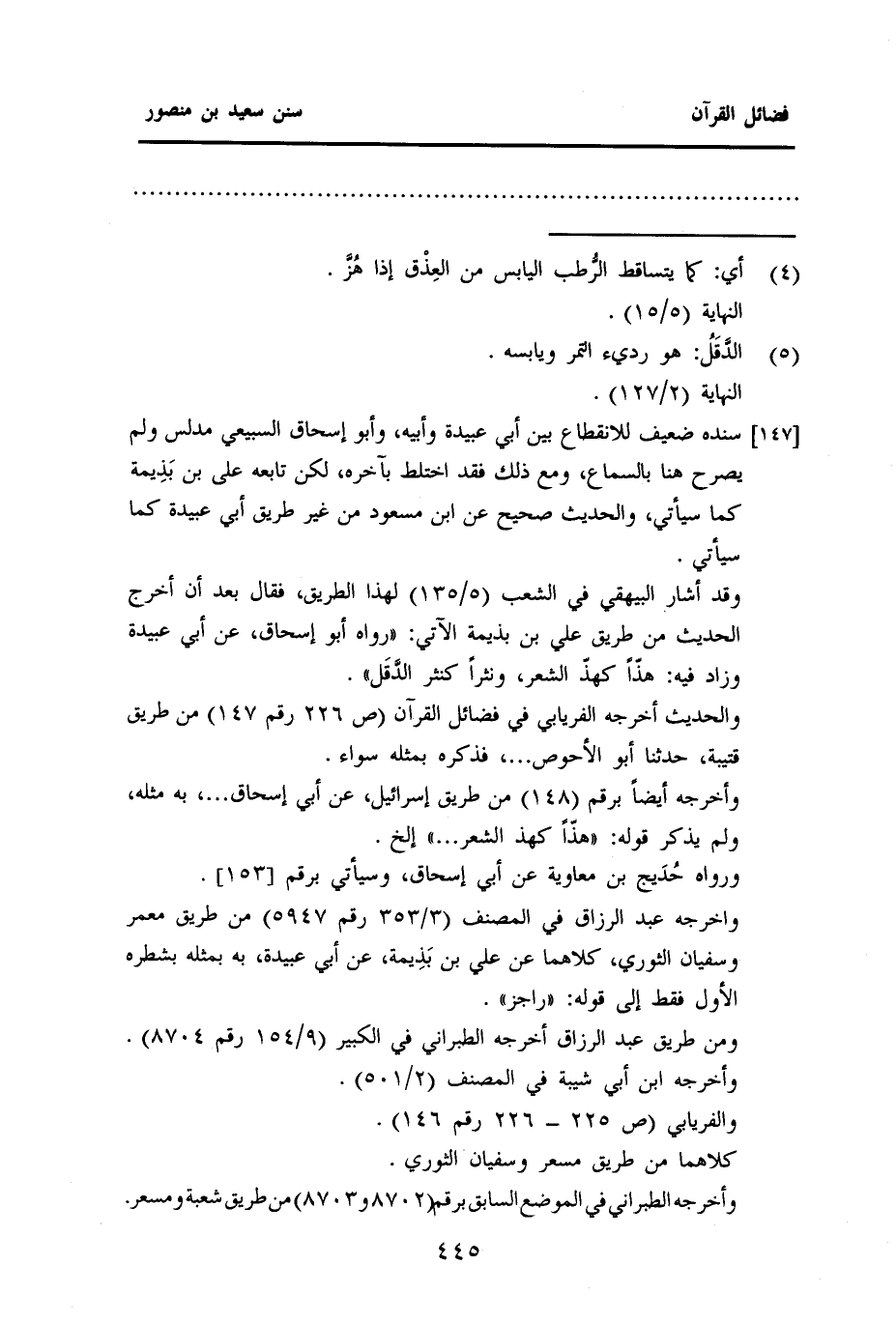 [١٤٧] سنده ضعيف للانقطاع بين أبي عبيدة وأبيه، وأبو إسحاق السبيعي مدلس ولم يصرح هنا بالسماع، ومع ذلك فقد اختلط بآخره، لكن تابعه على بن بَذِيمة كما سيأتي، والحديث صحيح عن ابن مسعود من غير طريق أبي عبيدة كما سيأتي.
