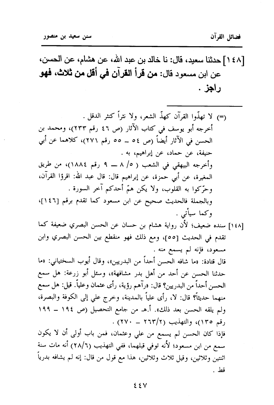 ١٤٨- حَدَّثَنَا سَعِيدٌ، قَالَ: نا خَالِدُ بْنُ عَبْدِ اللَّهِ، عَنْ هِشَامٍ، عَنِ الْحَسَنِ، عَنِ ابْنِ مَسْعُودٍ، قَالَ: مَنْ قَرَأَ الْقُرْآنَ فِي أَقَلَّ مِنْ ثَلَاثٍ، فَهُوَ رَاجِزٌ.