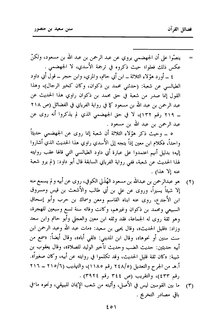 ٤ - أورد هؤلاء الثلاثة - ابن أبي حاتم، والمزي، وابن حجر - قول أبي داود الطيالسي عن شعبة: (حدثني محمد بن ذكوان، وكان كخير الرجال)، وهذا القول إنما صدر من شعبة في حق محمد بن ذكوان راوي هذا الحديث عَنْ عَبْدِ الرَّحْمَنِ بْنِ عَبْدِ الله بن مسعود كما في رواية الفريابي في "الفضائل" (ص ٢١٨ - ٢١٩ رقم ١٣٢)، لا في حق الجهضمي الذي لم يذكروا أنه روى عَنْ عَبْدِ الرَّحْمَنِ بْنِ عَبْدِ الله بن مسعود.