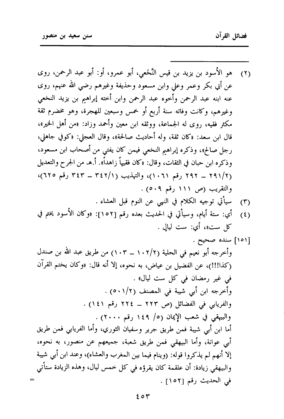 أما ابن أبي شيبة فمن طريق جرير وسفيان الثوري، وأما الفريابي فمن طريق أبي عوانة، وأما البيهقي فمن طريق شعبة، جميعهم عن منصور، به نحوه، إلا أنهم لم يذكروا قوله: (وَيَنَامُ فِيمَا بَيْنَ الْمَغْرِبِ وَالْعِشَاءِ)، وعند ابن أبي شيبة والبيهقي زيادة: أن علقمة كان يقرؤه في كل خمس ليال، وهذه الزيادة ستأتي في الحديث رقم [١٥٢]. =