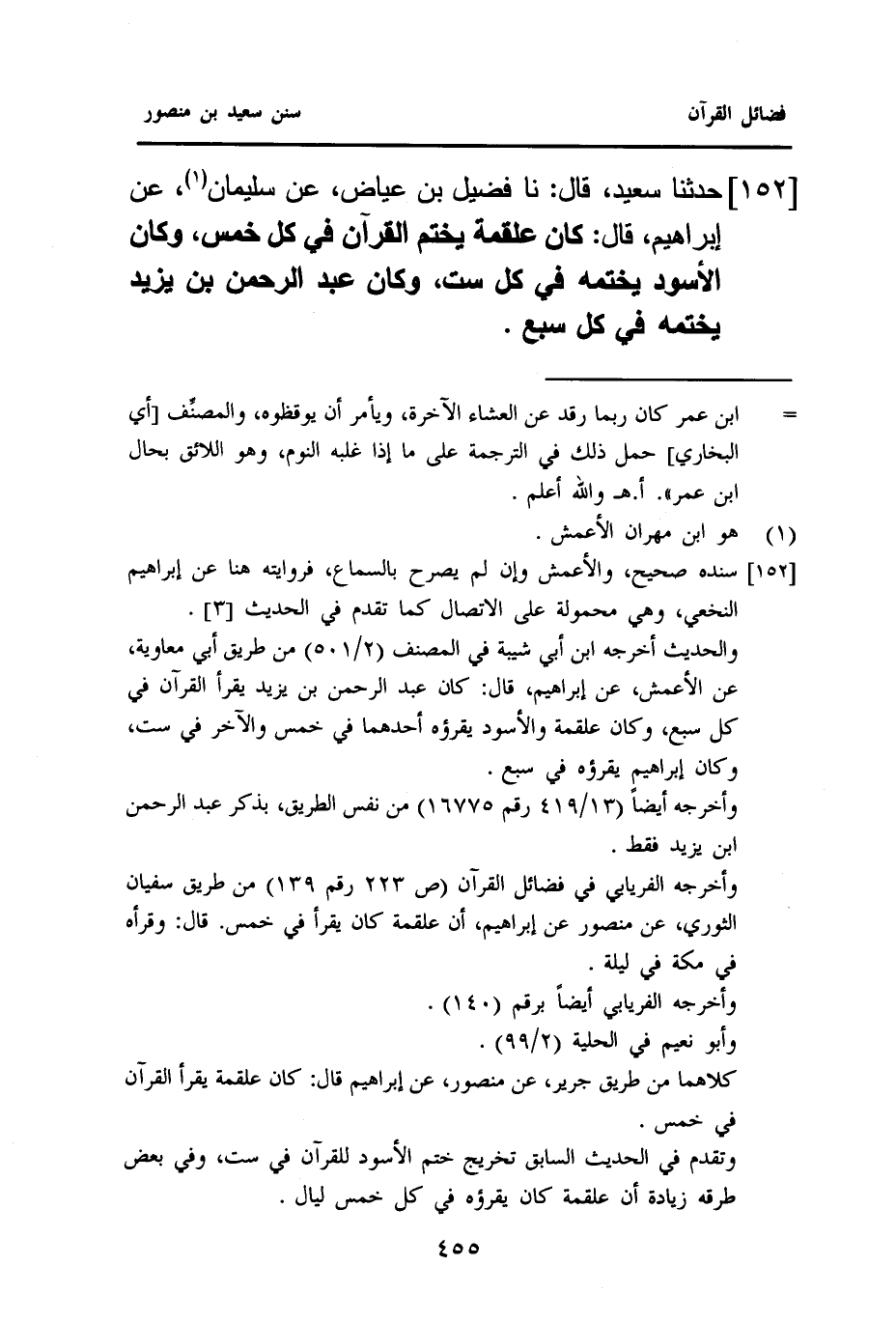 ١٥٢ - حَدَّثَنَا سَعِيدٌ، قَالَ: نا فُضَيْلٌ بْنُ عِيَاضٍ، عَنْ سُلَيْمَانَ (¬١)، عَنْ إِبْرَاهِيمَ، قَالَ: كَانَ عَلْقَمَةُ يَخْتِمُ الْقُرْآنَ فِي كُلِّ خَمْسٍ، وَكَانَ الْأَسْوَدُ يَخْتِمُهُ فِي كُلِّ سِتٍّ، وَكَانَ عَبْدُ الرَّحْمَنِ بْنُ يَزِيدَ يختمه في كل سبع.