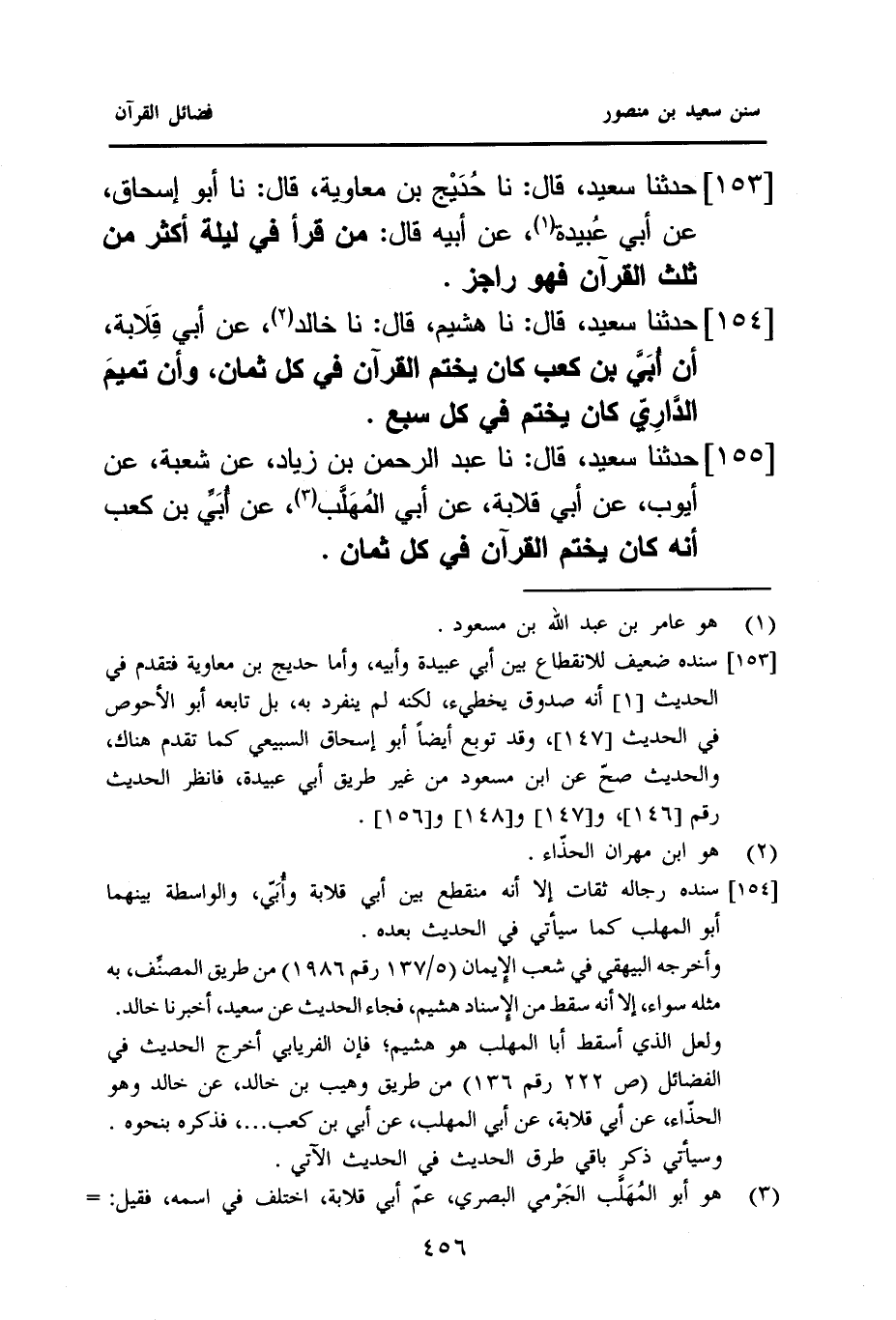 ١٥٤ - حَدَّثَنَا سَعِيدٌ، قَالَ: نا هُشَيْمٌ، قَالَ: نا خَالِدٌ (¬٢)، عَنْ أَبِي قِلَابة، أَنَّ أُبَيَّ بْنَ كَعْبٍ كَانَ يَخْتِمُ الْقُرْآنَ في كل ثمان، وأن تميمَ الدَّارِيّ كَانَ يَخْتِمُ فِي كُلِّ سَبْعٍ.