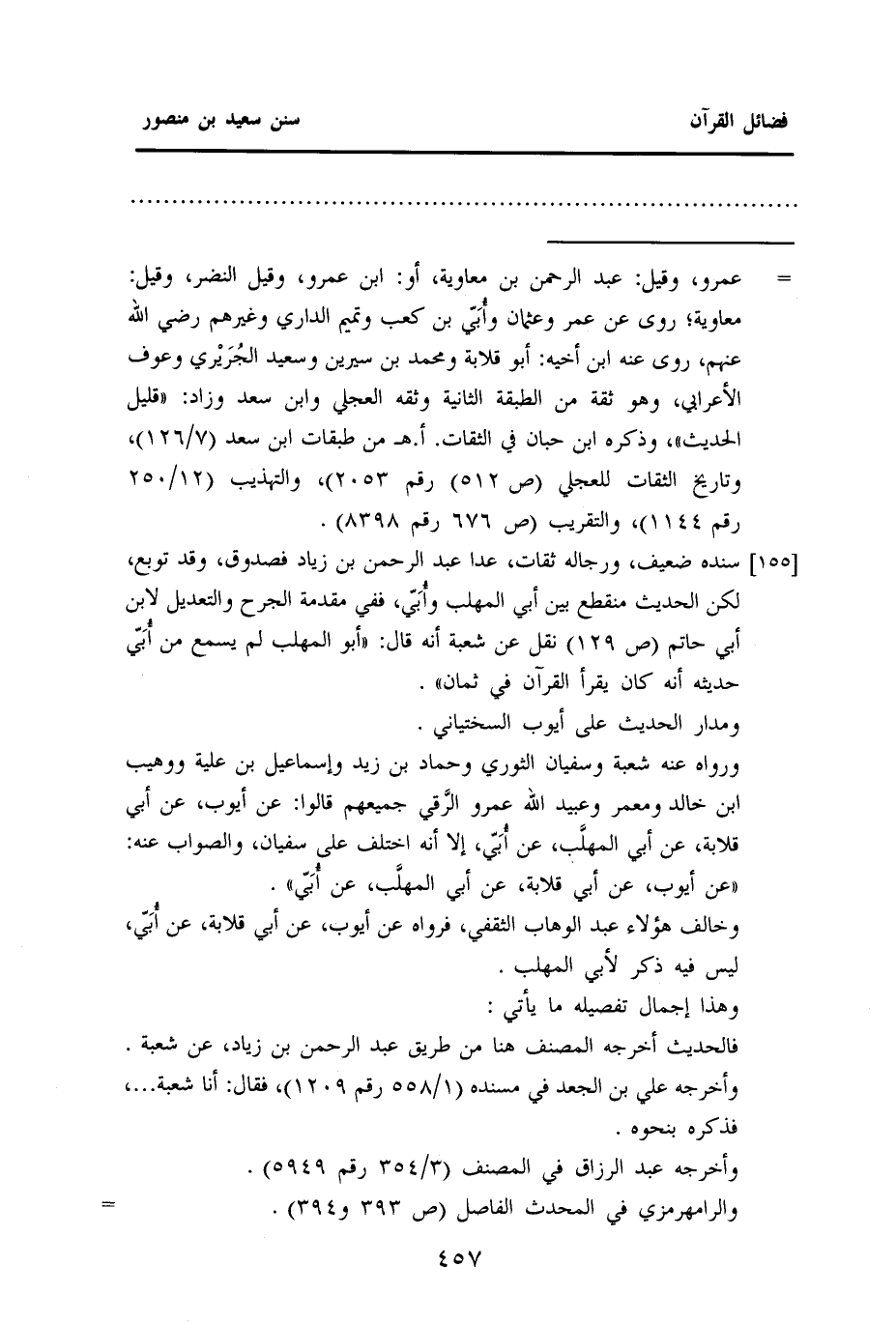 [١٥٥] سنده ضعيف، ورجاله ثقات، عدا عبد الرحمن بن زياد فصدوق، وقد توبع، لكن الحديث منقطع بين أبي المهلب، وأُبَيّ، ففي مقدمة "الجرح والتعديل" لابن أبي حاتم (ص١٢٩) نقل عن شعبة أنه قال: ((أبو المهلب لم يسمع من أُبَيّ حديثه أنه كان يقرأ القرآن في ثمان)) .