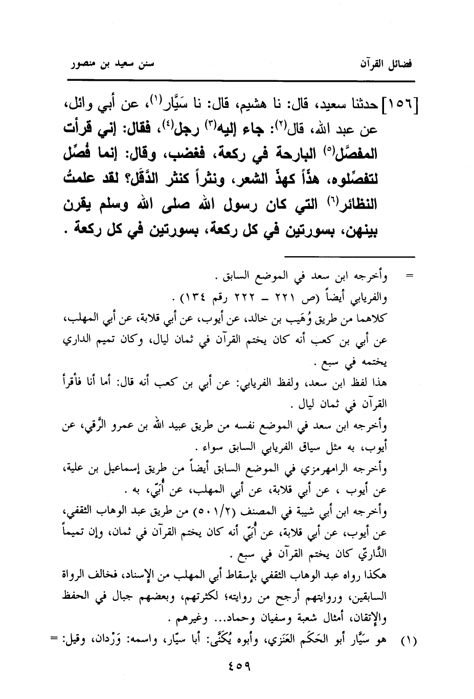 ١٥٦ - حَدَّثَنَا سَعِيدٌ، قَالَ: نا هُشَيْمٌ قَالَ: نا سَيَّار (¬١)، عَنْ أَبِي وَائِلٍ، عَنْ عَبْدِ اللَّهِ، قَالَ (¬٢): جَاءَ إِلَيْهِ (¬٣) رَجُلٌ (¬٤)، فَقَالَ: إِنِّي قَرَأْتُ المفصَّل (¬٥) الْبَارِحَةَ فِي رَكْعَةٍ، فَغَضِبَ، وَقَالَ: إِنَّمَا فُصِّل لتفصِّلوه، هَذًّا كَهَذِّ الشِّعْرِ، وَنَثْرًا كَنَثْرِ الدَّقَل؟ لَقَدْ علمتُ النَّظَائِرَ (¬٦) الَّتِي كَانَ رَسُولُ اللَّهِ صَلَّى اللهُ عَلَيْهِ وَسَلَّمَ يَقْرِنُ بَيْنَهُنَّ، بِسُورَتَيْنِ فِي كُلِّ رَكْعَةٍ، بِسُورَتَيْنِ فِي كل ركعة.