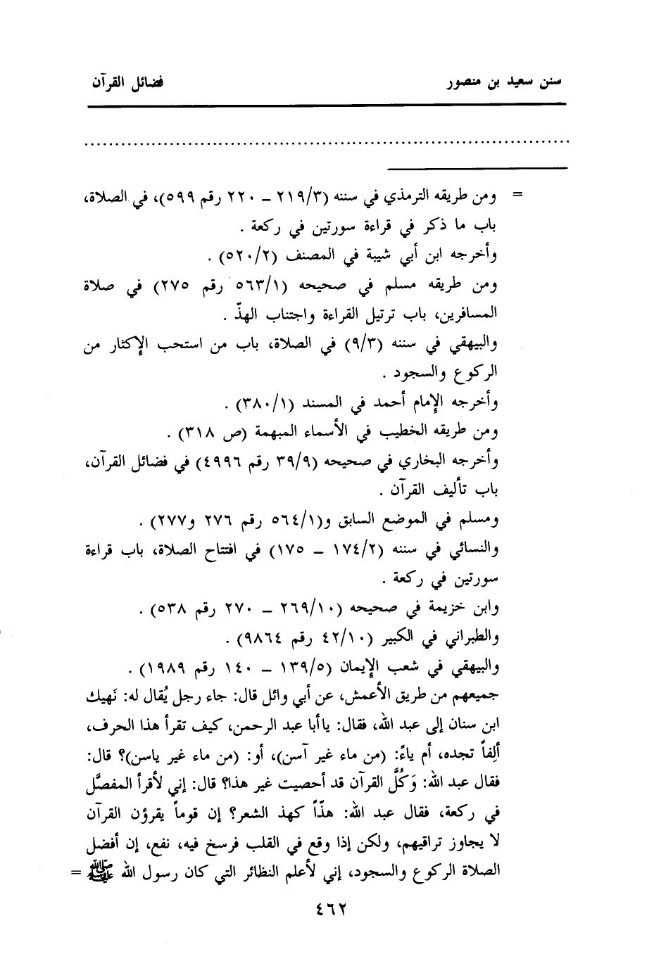 جميعهم من طريق الأعمش، عن أبي وائل، قال: جاء رجل يُقال له: نَهيك بن سنان إلى عبد الله، فَقَالَ: يَا أَبَا عَبْدِ الرَّحْمَنِ كيف تقرأ هذا الحرف ألِفًا تجده أم ياءً: (من ماء غير آسن) ، أو: (من ماء غير ياسن) قال: فقال عبد الله: وكُلَّ القرآن قد أحصيت غير هذا؟ قال: إني لأقرأ المفصَّل في ركعة، فقال عبد الله هذًّا كهذّ الشعر؟ إن قومًا يقرءون القرآن لا يجاوز تراقيهم ولكن إذا وقع فى القلب فرسخ فيه نفع إن أفضل الصلاة الركوع والسجود إني لأعلم النَّظَائِرَ الَّتِي كَانَ رَسُولُ اللَّهِ - صلى الله عليه وسلم- =