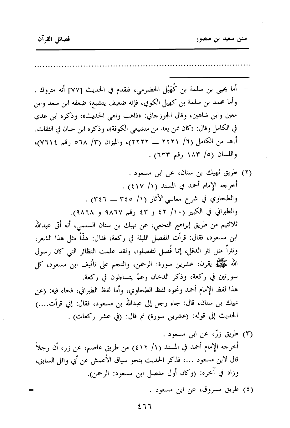ثلاثتهم من طريق إبراهيم النخعي، عن نهيك بن سنان السلمي، أنه أتى عبد الله بن مسعود، فقال: قرأت المفصل الليلة في ركعة، فقال: هذًّا مثل هذا الشعر، ونثرًا مثل نثر الدقل، إنما فُصل لتفصلوا، ولقد عَلِمْتُ النَّظَائِرَ الَّتِي كَانَ رَسُولُ اللَّهِ - صَلَّى اللهُ عَلَيْهِ وَسَلَّمَ - يقرن، عشرين سورة: الرحمن، والنجم على تأليف ابن مسعود، كل سورتين في ركعة، وذكر الدخان وعمّ يتساءلون في ركعة.