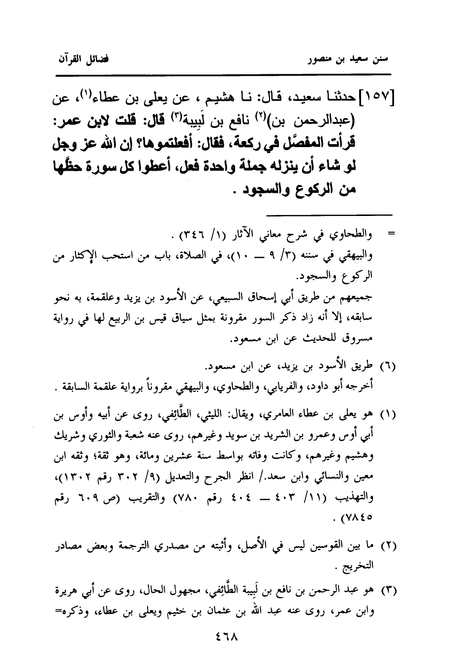 ١٥٧ - حَدَّثَنَا سَعِيدٌ، قَالَ: نا هُشَيْمٌ، عَنْ يَعْلَى بْنِ عَطَاءٍ (¬١)، عَنْ (عَبْدِ الرَّحْمَنِ بْنِ) (¬٢) نَافِعِ بْنِ لَبِيبة (¬٣) قَالَ: قُلْتُ لِابْنِ عُمَرَ: قَرَأْتُ المفصَّل فِي رَكْعَةٍ، فَقَالَ: أَفَعَلْتُمُوهَا؟ إِنَّ اللَّهَ عَزَّ وَجَلَّ لَوْ شَاءَ أَنْ يُنَزِّلَهُ جُمْلَةً وَاحِدَةً فَعَلَ، أَعْطُوا كُلَّ سُورَةٍ حظَّها من الركوع والسجود.